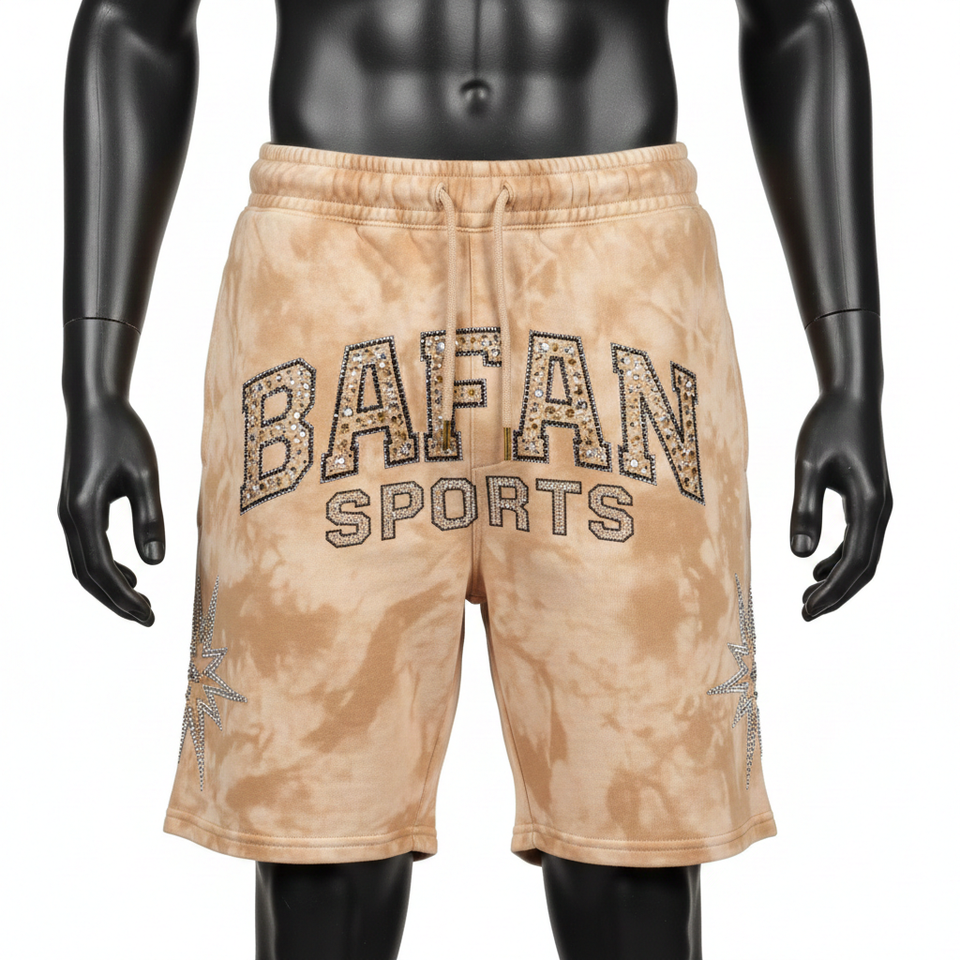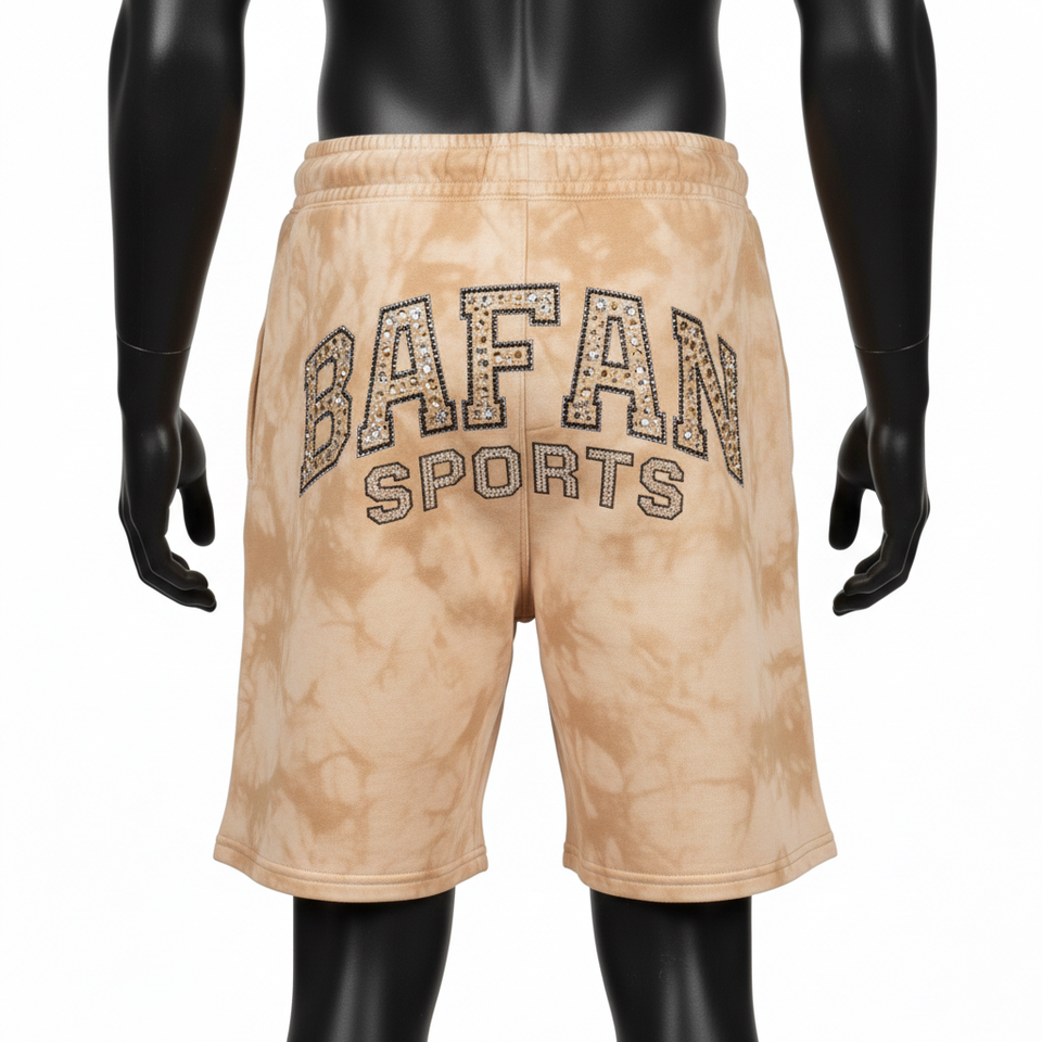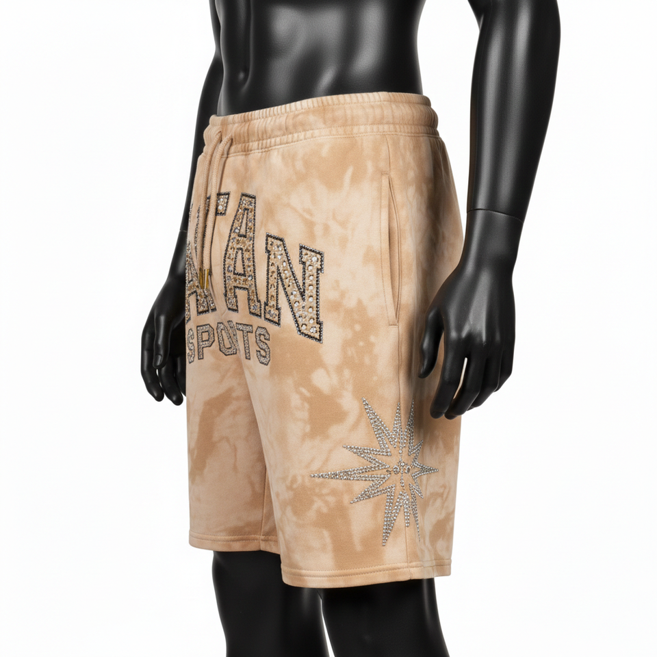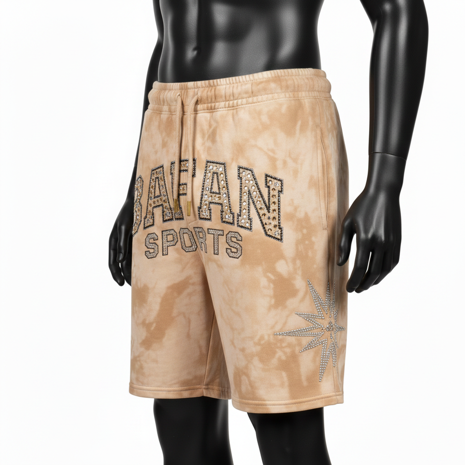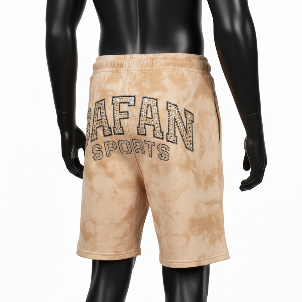กางเกงขาสั้นผู้ชายผ้าฝ้ายฟลีซหนา 320 GSM สีแทนฟอกกรด สัมผัสนุ่ม ประดับด้วยคริสตัล พร้อมปักโลโก้ตามสั่ง