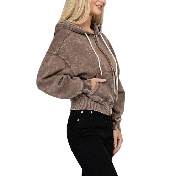 เสื้อฮู้ดซิปแบบฟอกกรดหนักสำหรับผู้หญิง 500GSM สตรีทแวร์พรีเมียม รับผลิตตามแบบ OEM แบรนด์ส่วนตัว โรงงานผู้ผลิต