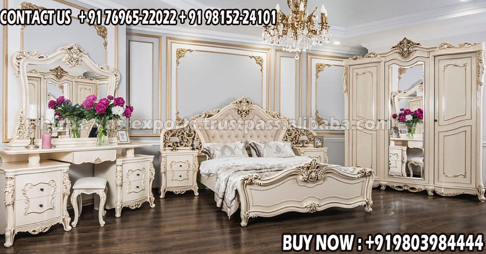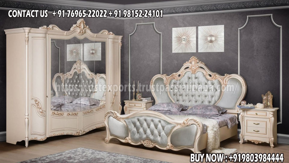 เตียงขนาดคิงไซส์แกะสลักลายหนัก พร้อมโต๊ะข้างเตียง