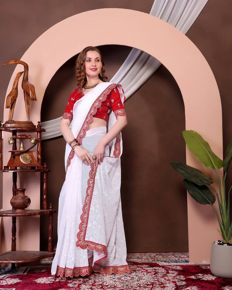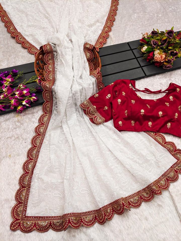 ผ้าซารีโบลลีวูดแบบชิคันการีเนื้อหนา ประดับด้วยดิ้นซารีและเลื่อม แต่งขอบสีแดงสดแบบโดดเด่น เหมาะสำหรับงานแต่งงาน งานปาร์ตี้ ซักได้ เนื้อผ้านุ่มสำหรับผู้หญิง