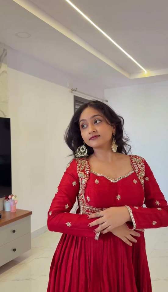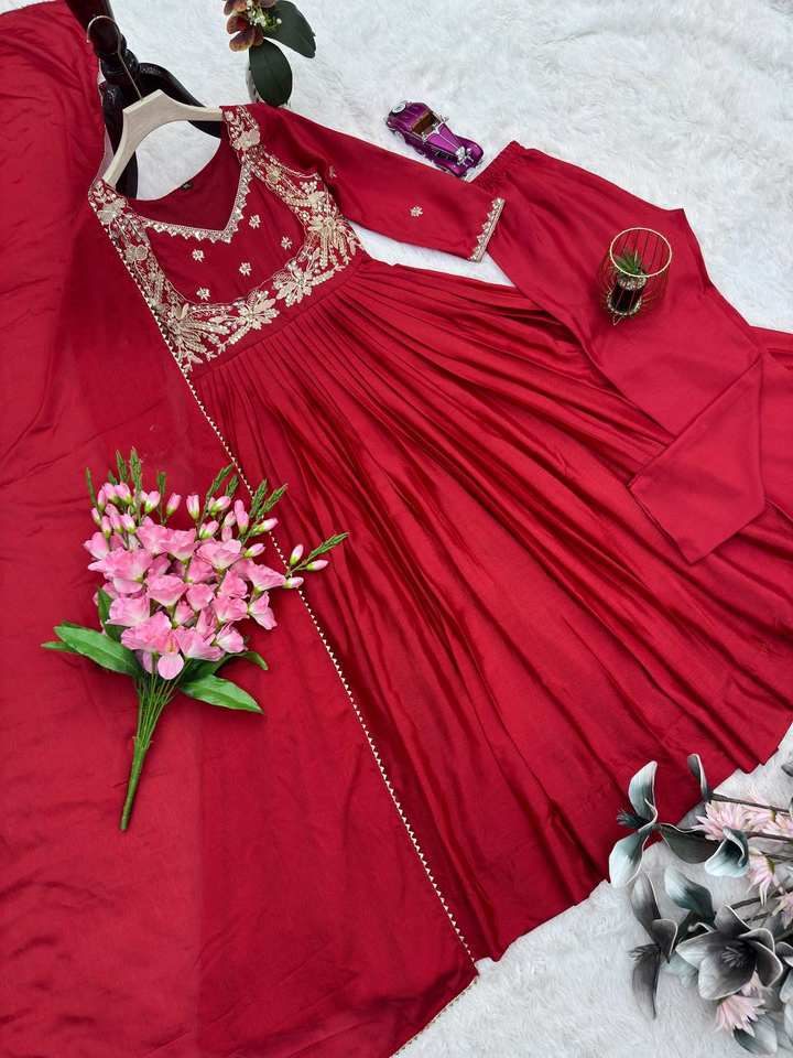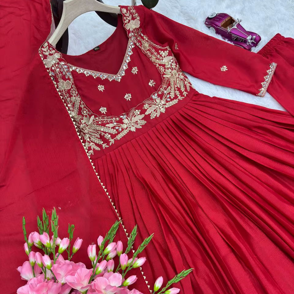 ชุดเดรสผ้าไหมชีนอนเนื้อหนา พร้อมงานปักลายและงานกระจกแท้ ชุดอานาร์กาลีเย็บสำเร็จพร้อมผ้าคลุมไหล่และกางเกงขายาว