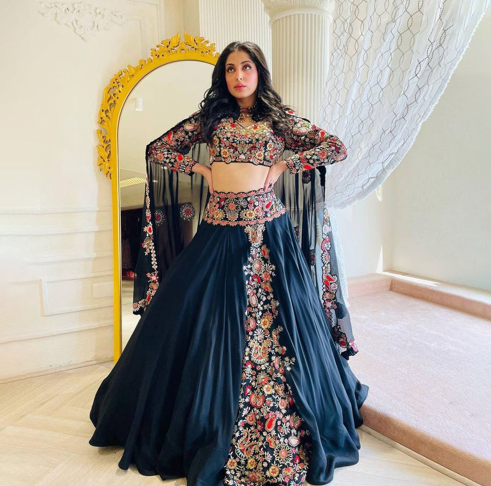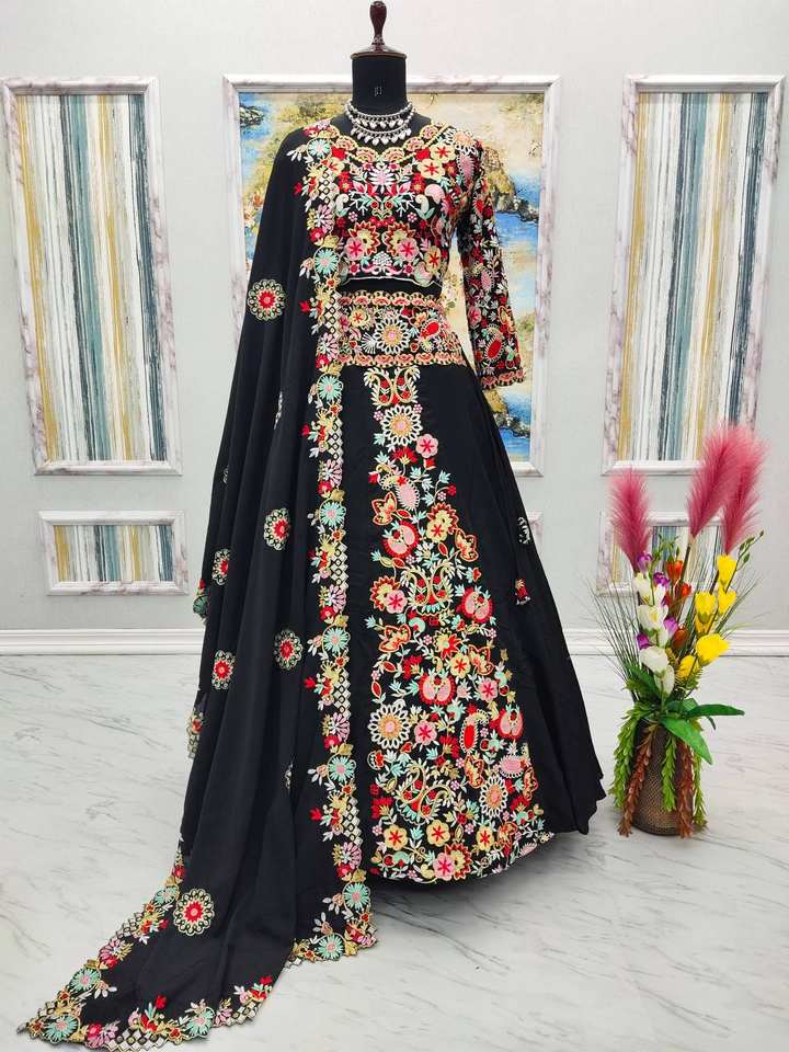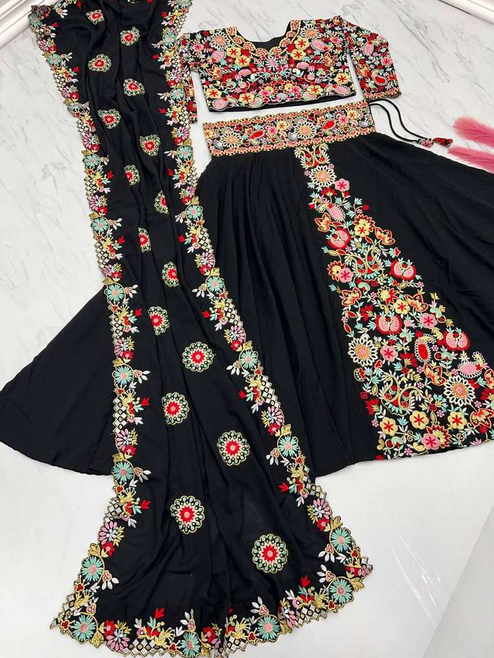 ชุดเลเฮนกาโชลีผ้าจอร์เจตต์สีดำงานปักลายหรูหรา แห้งเร็ว ใส่ได้สองด้าน เหมาะสำหรับงานแต่งงาน งานดิวาลี และงานปาร์ตี้