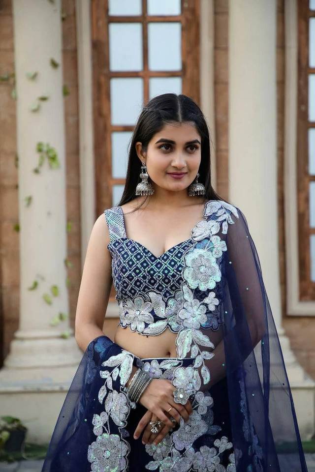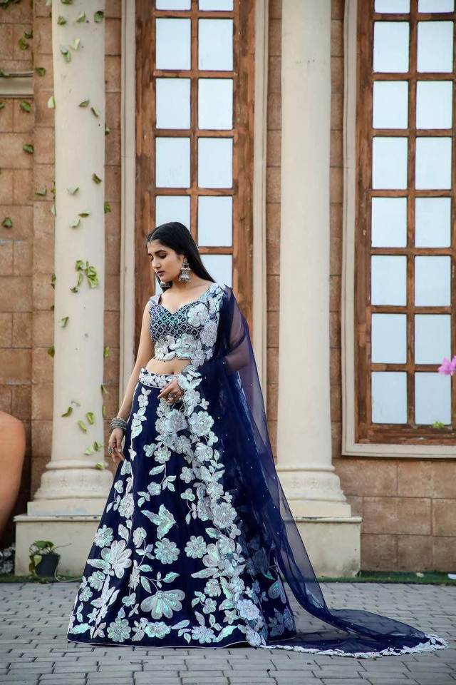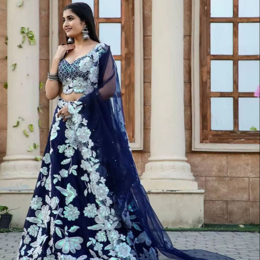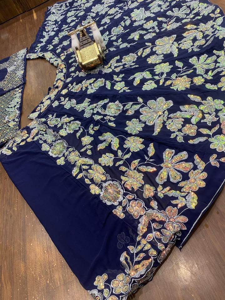 ชุดผ้าจอร์เจียเทียมสีฟ้ารอยัลดีไซน์เนอร์พร้อมการปักเลื่อมทำงานชุด lehenga choli สำหรับผู้หญิง