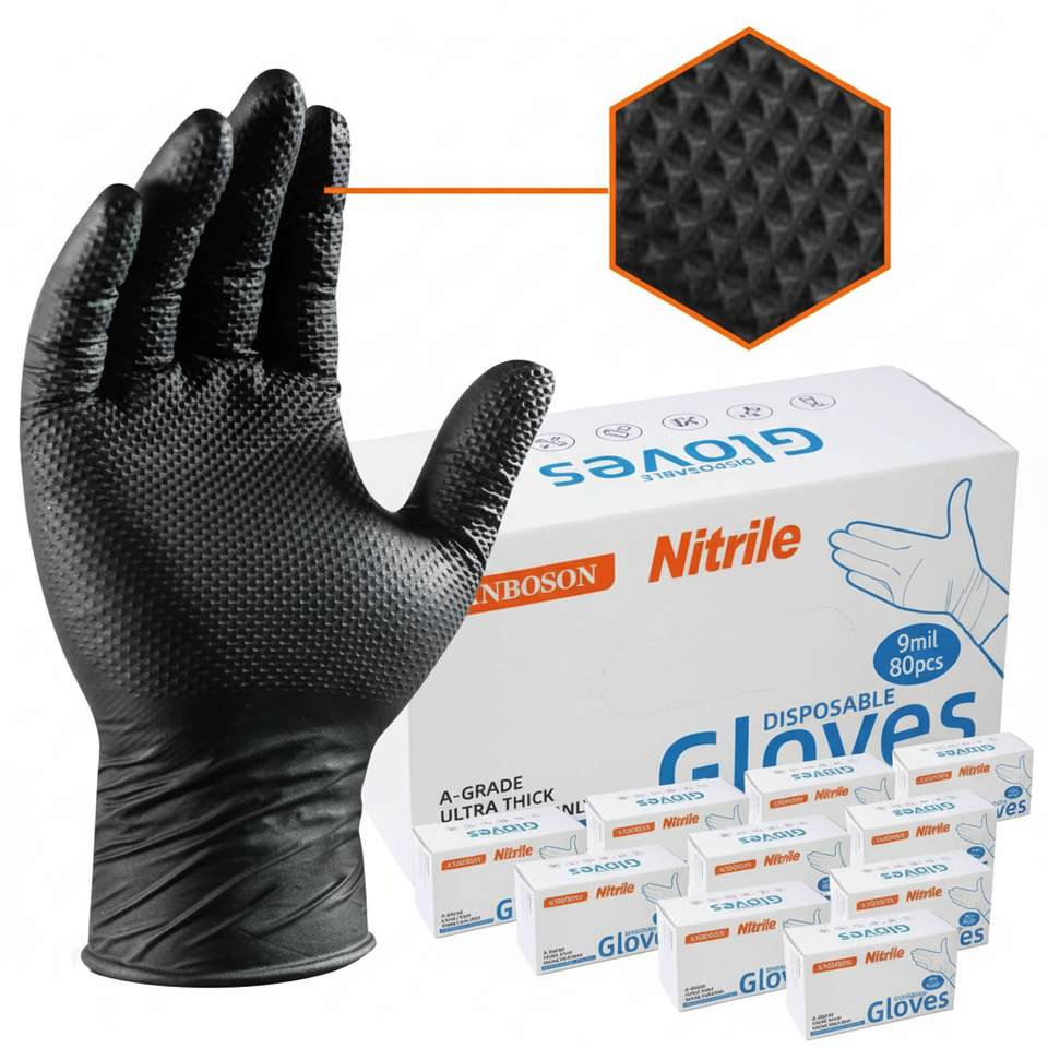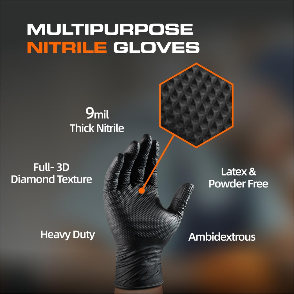 ถุงมือไนไตรล์แบบหนา 10 มิล ไม่มีแป้ง ปลายนิ้วแบบมีลายเพชร ถุงมือช่างแบบใช้แล้วทิ้ง 100 ชิ้น สีดำ/สีส้ม