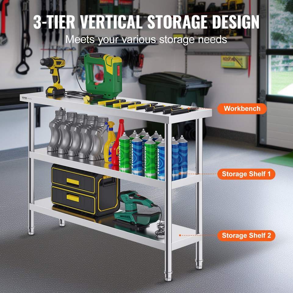 โต๊ะเตรียมอาหารสแตนเลสสำหรับใช้ในบ้าน14x48x34นิ้วโต๊ะเตรียมอาหาร2ชั้นปรับได้