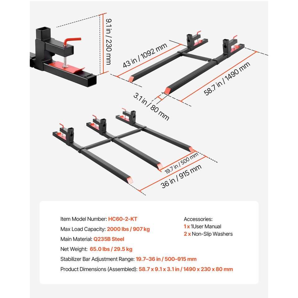 ตะเกียบรถแทรกเตอร์แบบหนัก รับน้ำหนักได้ 2000 ปอนด์ ขนาด 60 นิ้ว พร้อมเหล็กกันโคลงปรับได้ แบบหนีบติดกับรถยกพาเลท