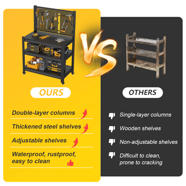 โต๊ะทำงานแบบมีล้อรับน้ำหนักได้ 3000 ปอนด์ พร้อมแผงแขวนอุปกรณ์ ชั้นวางปรับระดับได้ รถเข็นเครื่องมือ และโต๊ะทำงานในโรงรถ