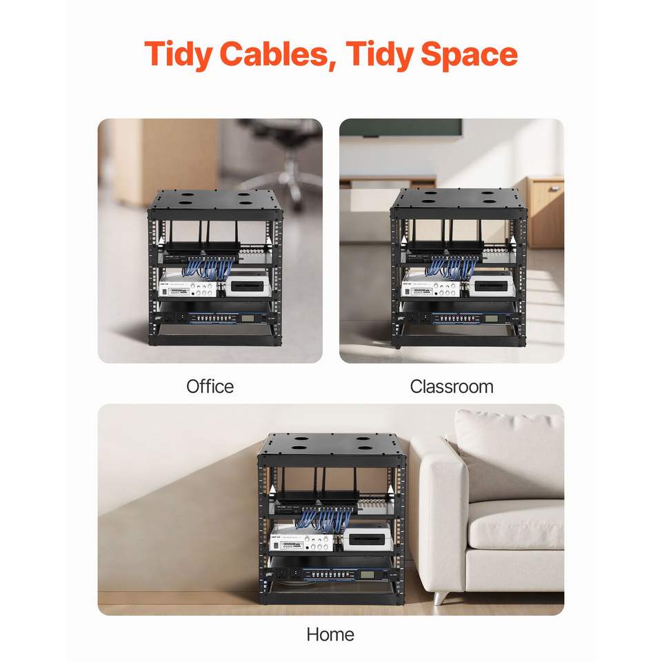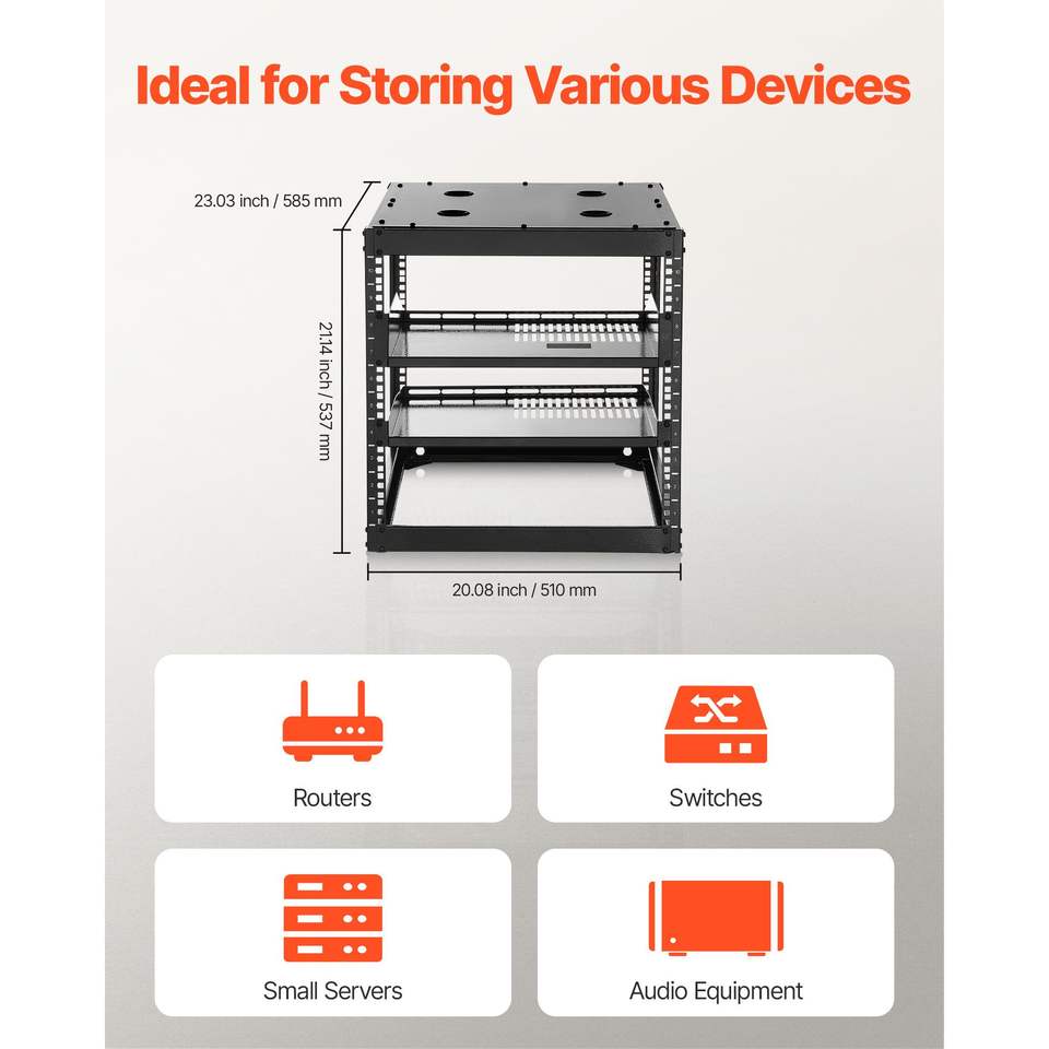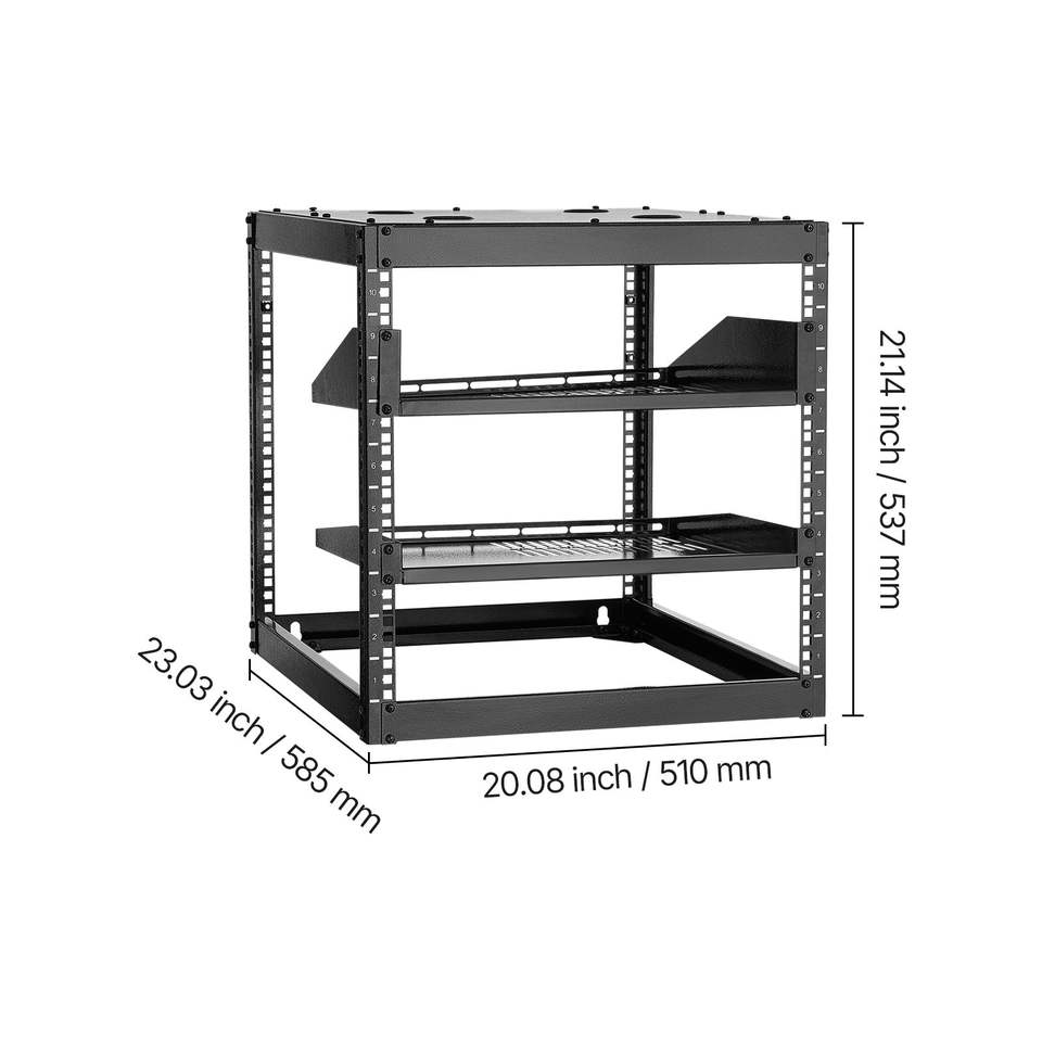 แร็คเครือข่ายแบบเปิด 4 เสา รับน้ำหนักมาก ขนาด 10U ลึก 23 นิ้ว ติดผนังหรือวางพื้นได้ พร้อมชั้นวางแบบมีช่องระบายอากาศ ลึก 23 นิ้ว