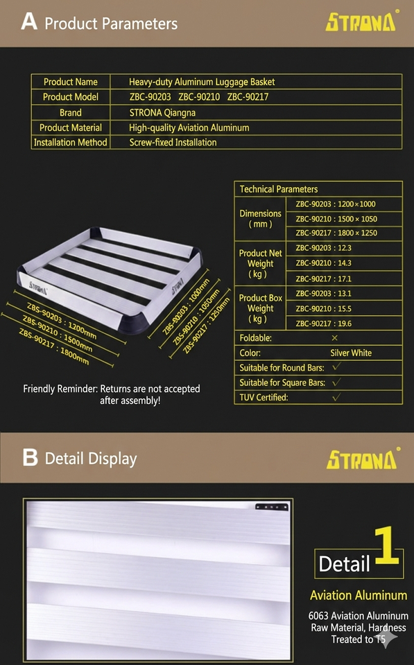 แร็คหลังคาอลูมิเนียมสำหรับบรรทุกสัมภาระแบบหนัก รุ่น Strona ZBC-90203 ขนาด 1200x1050x120 มม.