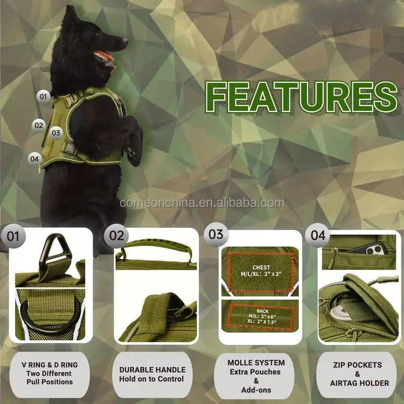 สายรัดสุนัขขนาดใหญ่หัวเข็มขัดโลหะไม่ดึงสายรัดสุนัขยุทธวิธี