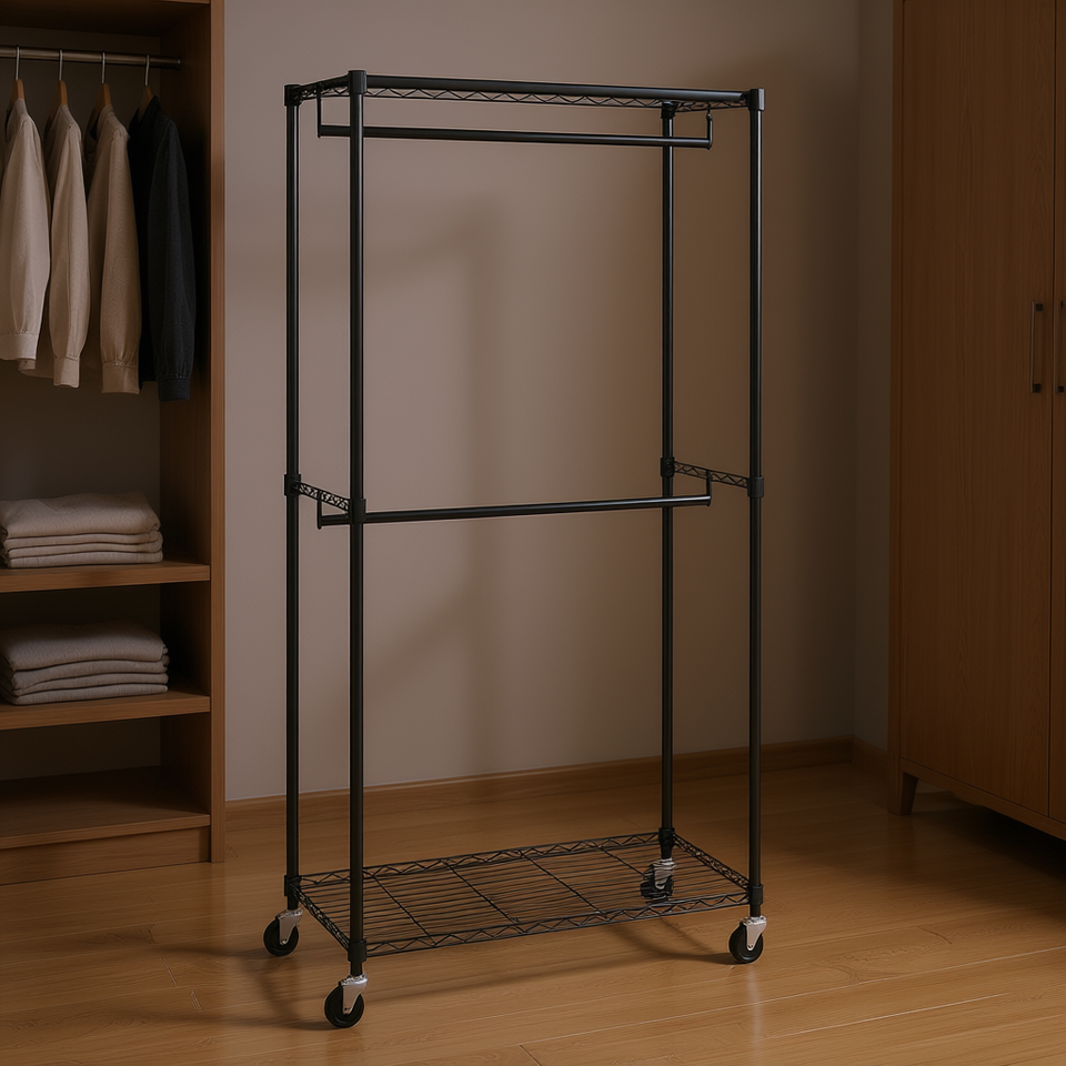 ราวแขวนเสื้อผ้าแบบแขวนสองชั้นสำหรับงานหนัก ท่อเหล็กขนาด 1 นิ้ว รับน้ำหนักได้ 300 ปอนด์ ชั้นวางของสำหรับใช้ในตู้เสื้อผ้า