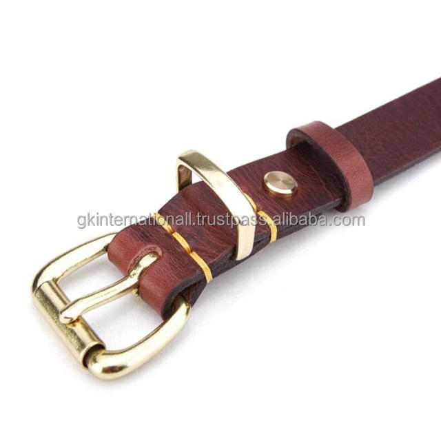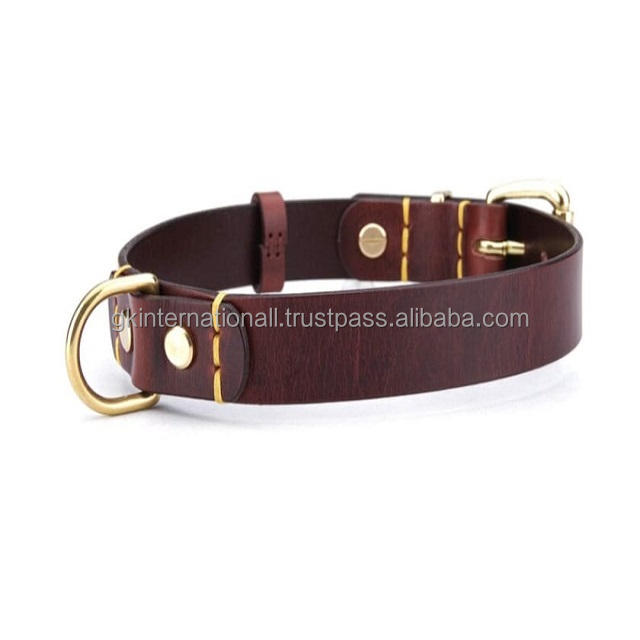 ปลอกคอสุนัขหนังแท้สีน้ําตาลสองชั้นสําหรับงานหนักสําหรับสัตว์เลี้ยงทุกขนาดพร้อมฮาร์ดแวร์ทองเหลืองชุบทองที่ปรับได้