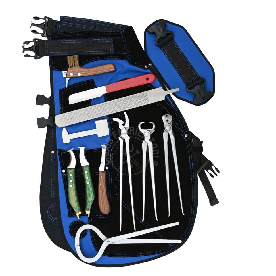 ชุดเครื่องมือช่างตัดแต่งกีบม้าแบบมืออาชีพ ประกอบด้วย คีมตัดแต่งกีบ ตะไบ ขัดเงา ตัดแต่งขน แปรงลวด มีด พร้อมผ้ากันเปื้อนหนังสำหรับตัดแต่งกีบ