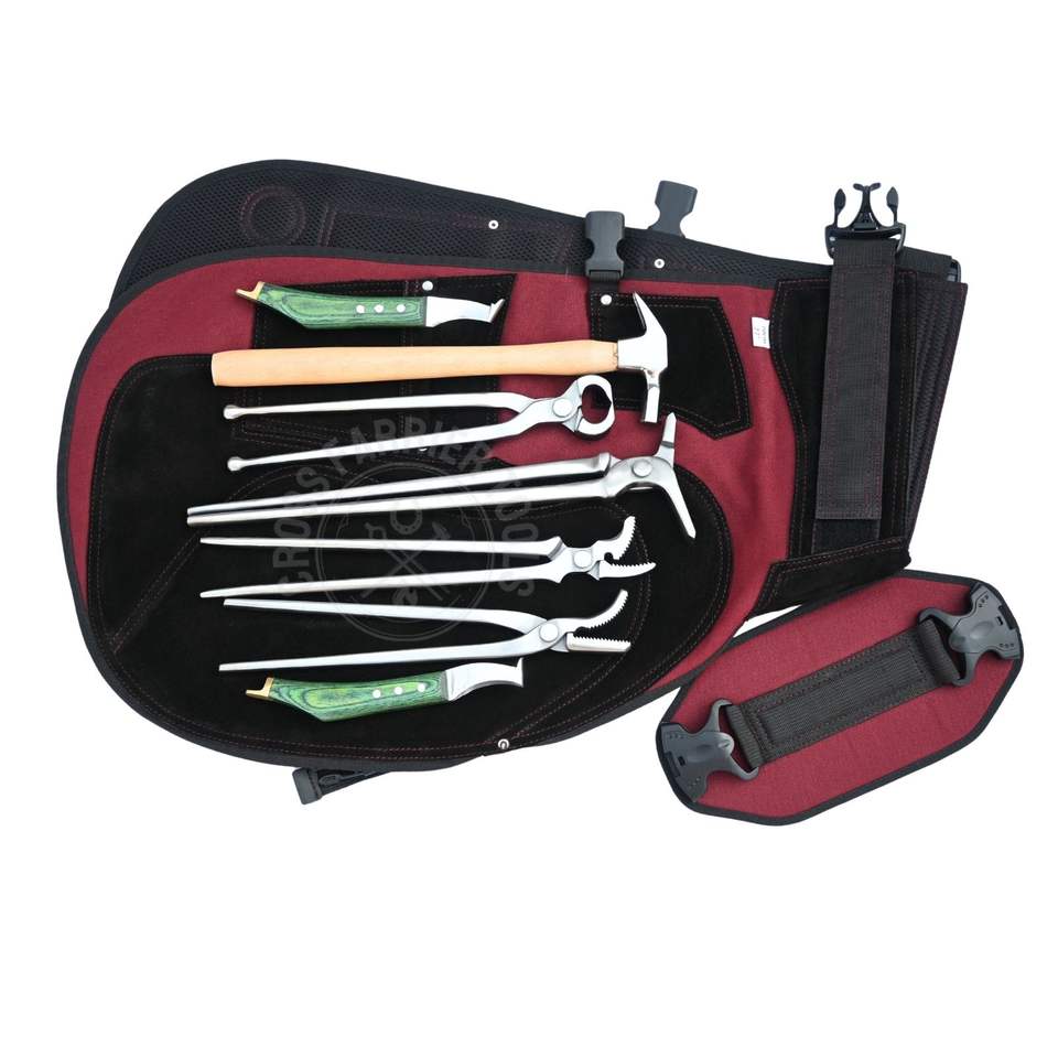 ชุดเครื่องมือช่างเกือกม้าแบบหนัก พร้อมค้อนตอกตะปู ที่ดันรองเท้า ผ้ากันเปื้อนสำหรับทำงาน เครื่องมือยึดตะปูแบบจระเข้ และมีดตัดสายรัด