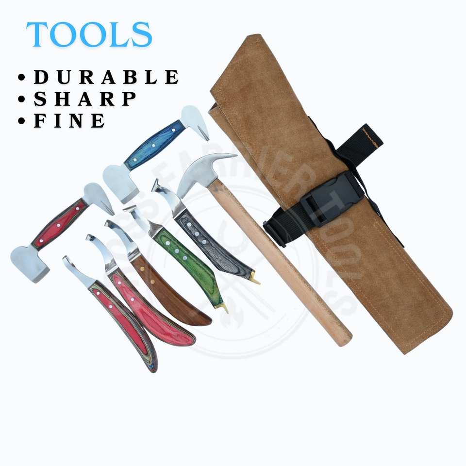 ชุดเครื่องมือช่างตัดแต่งกีบม้าแบบหนัก พร้อมใบมีด D, มีดตัดแต่งกีบแบบสองด้าน, ที่ขูดกีบ, มีดตัดแผล, ค้อน และมีดปลายทองเหลืองสองอัน