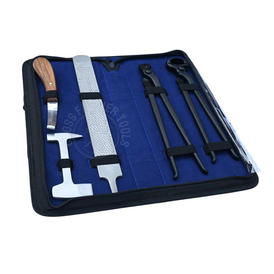 ชุดเครื่องมือช่างตัดแต่งกีบม้าแบบหนัก พร้อมที่ตัดกีบสีดำ ใบมีดเหล็กคมสองด้าน มีดตัดแต่งกีบ ตะไบขัดกีบ และที่ดึงตะปู