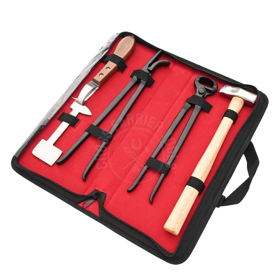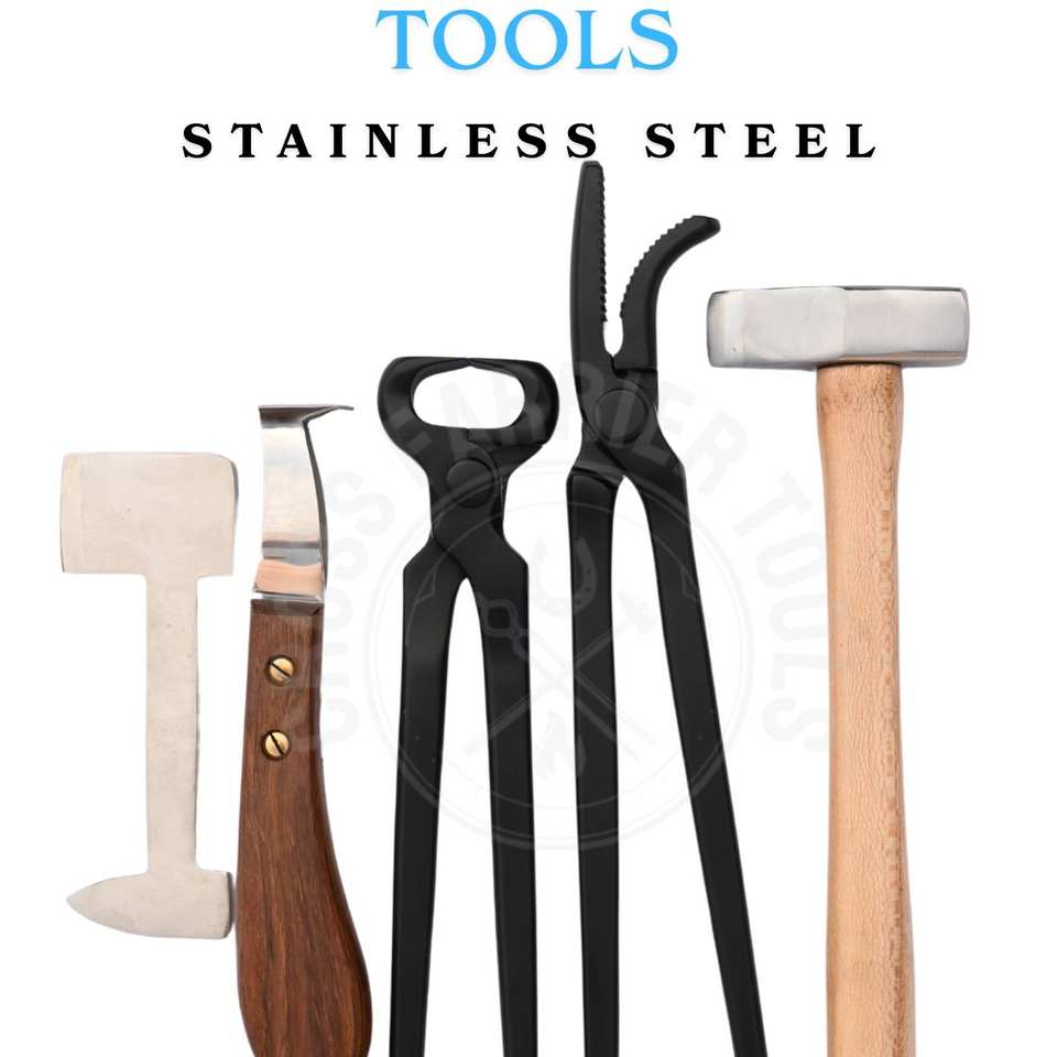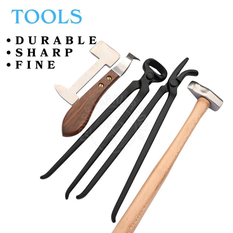 ชุดเครื่องมือช่างเกือกม้าแบบหนัก พร้อมค้อนเกือกม้าแบบหนามลายจระเข้สีดำ มีดตัดกีบม้าสีดำ คีมตัดกีบม้าสีดำ และเครื่องมือขัดกีบม้า