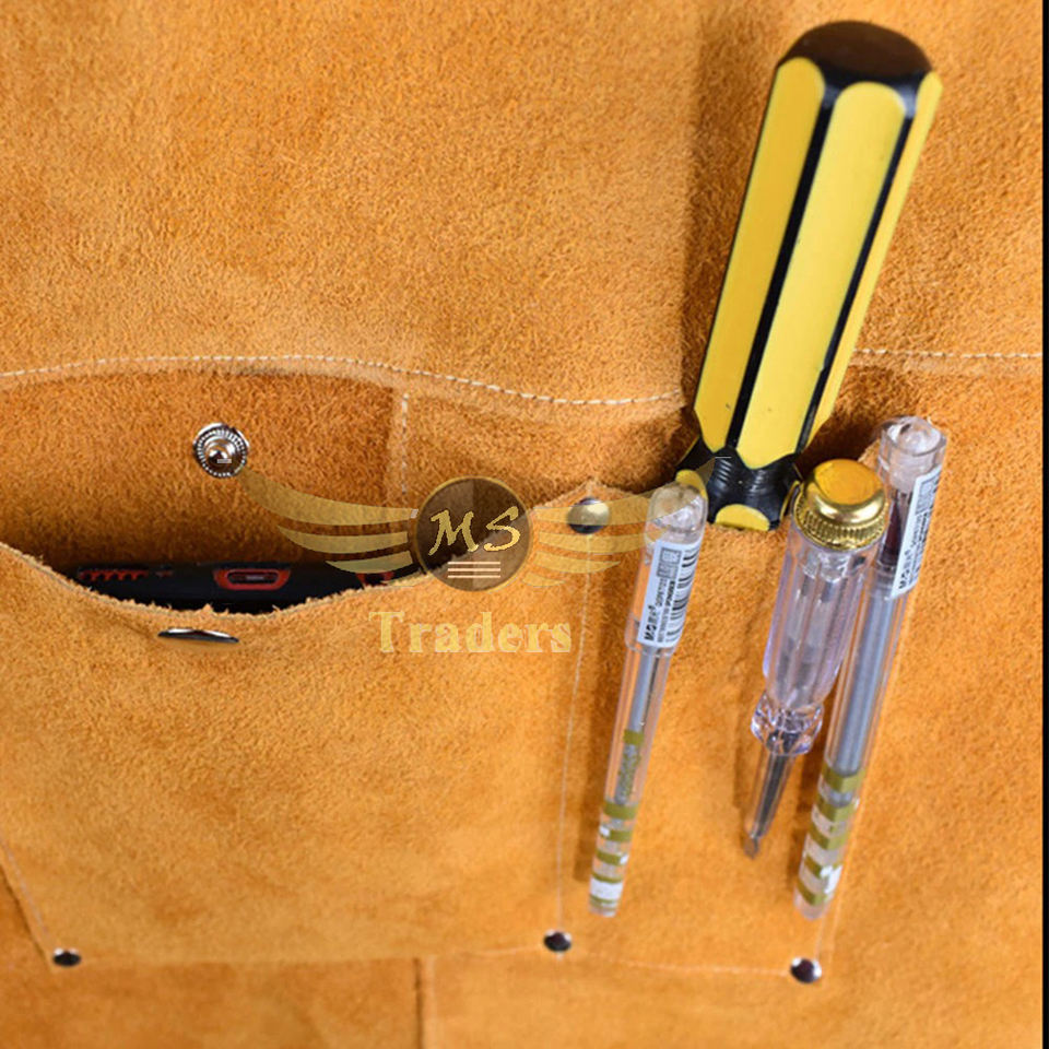 ผ้ากันเปื้อนหนังงานเชื่อมงานไม้สำหรับผู้ชายผู้หญิงผ้ากันเปื้อนสำหรับงานโลหะกันไฟป้องกันด้วยกระเป๋าเครื่องมือทนทาน