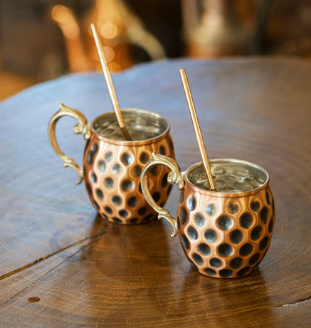 แก้วมักทรงมอสโกมิวล์ดีไซน์แบบทุบสำหรับงานหนักแก้วเบียร์และไวน์ทำจากทองแดงบริสุทธิ์สองชิ้นสั่งได้
