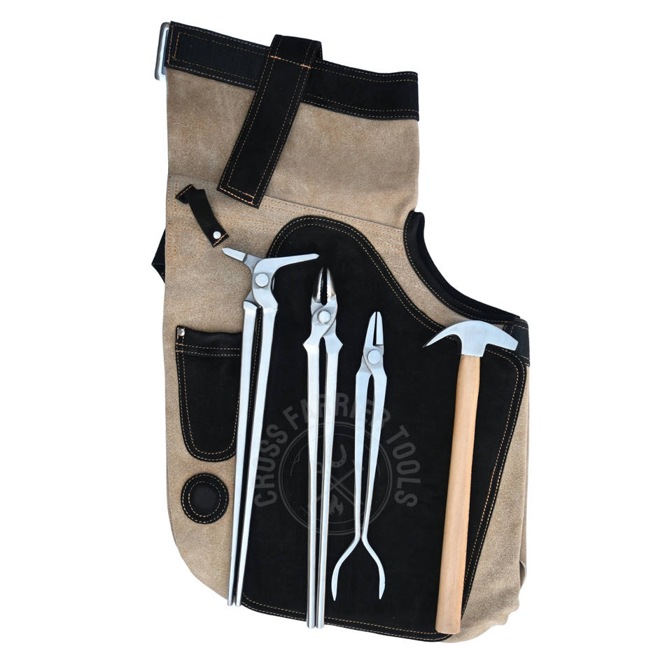 ชุดเครื่องมือตีเกือกม้าแบบหนัก พร้อมผ้ากันเปื้อนหนัง ค้อนตีเกือก คีมตีเกือกปลายมน คีมหนีบเกือก และเครื่องมือถ่างเกือก