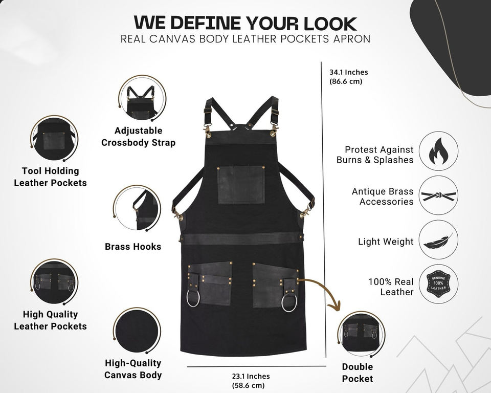 ผ้ากันเปื้อนหนังแคนวาสแบบหนาทนทาน พร้อมซิปปรับระดับได้ สายคล้องหลังแบบไขว้ เหมาะสำหรับเชฟ บาร์บีคิว บาริสต้า ช่างตัดผม ช่างไม้ และใส่เครื่องมือต่างๆ