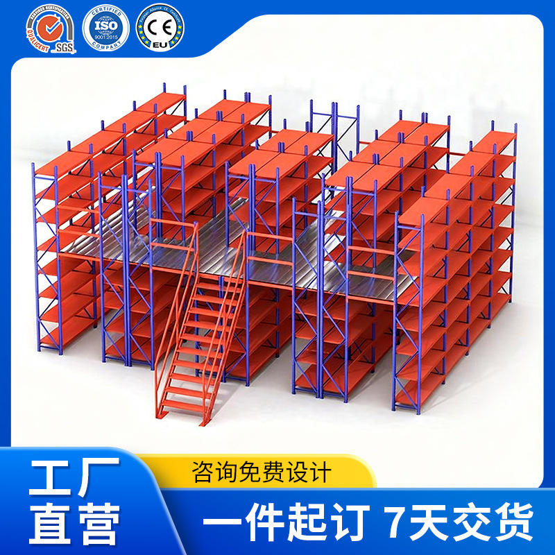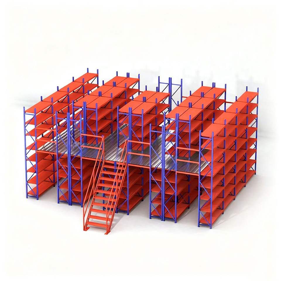 ชั้นวางสินค้าแบบ Heavy Duty Mezzanine ทำจากเหล็ก Q235 สองชั้น สำหรับคลังสินค้า โรงงาน จัดเก็บสินค้า สามารถปรับแต่งได้ ประกอบด้วยสกรู สีฟ้า