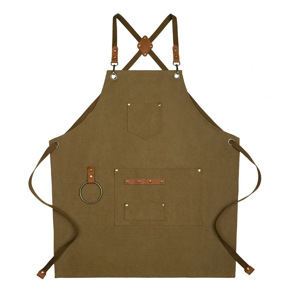ผ้ากันเปื้อนผ้าแคนวาสแบบมีหลายกระเป๋าสำหรับใช้กับบาร์บีคิวและซักด้วยสายหนัง
