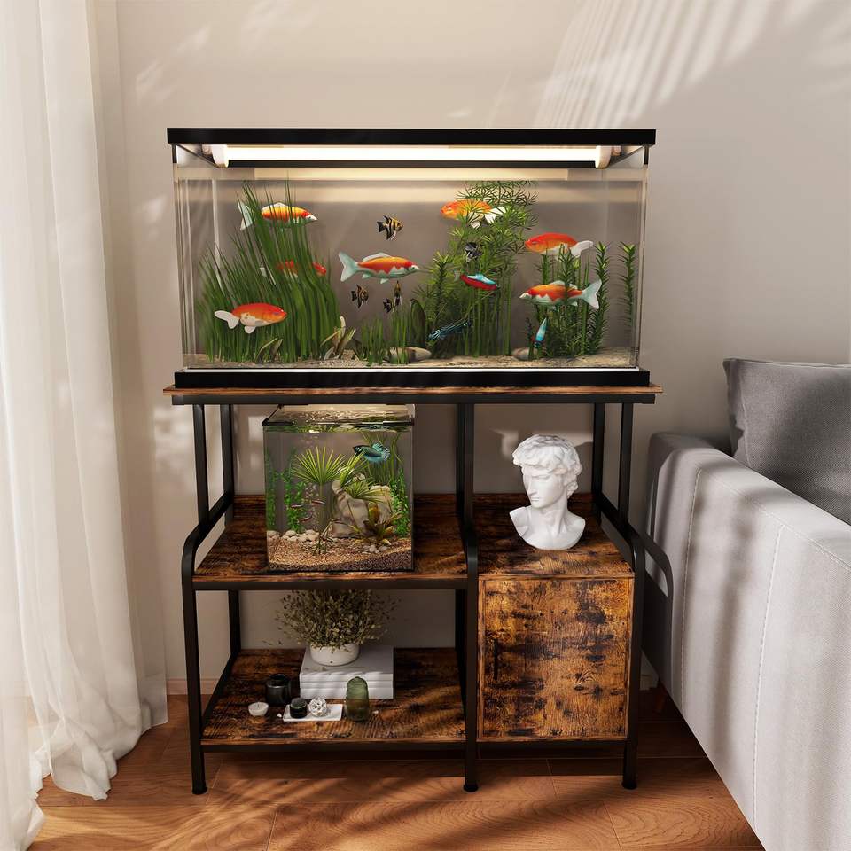 ตู้ปลาสี่เหลี่ยมทรงแข็งแรงทนทาน สีดำ สแตนเลส สำหรับบ้าน/สำนักงาน พร้อมช่องเสียบปลั๊กไฟและตู้เก็บของ สำหรับเต่าและสัตว์เลื้อยคลาน