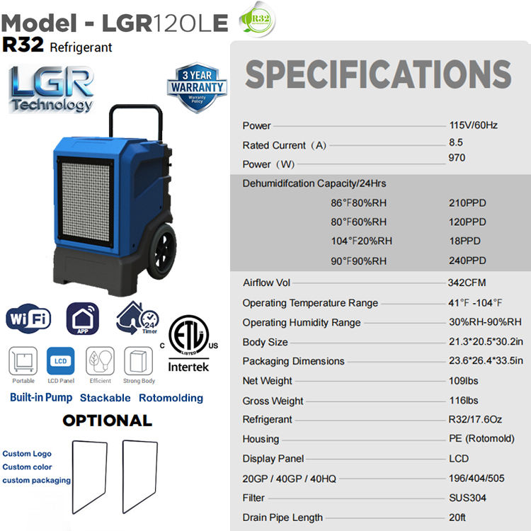 ชื่อสินค้า:เครื่องลดความชื้น LGR สำหรับงานฟื้นฟูความเสียหายจากน้ำ รุ่น Heavy-Duty Restoration 120-210 PPD