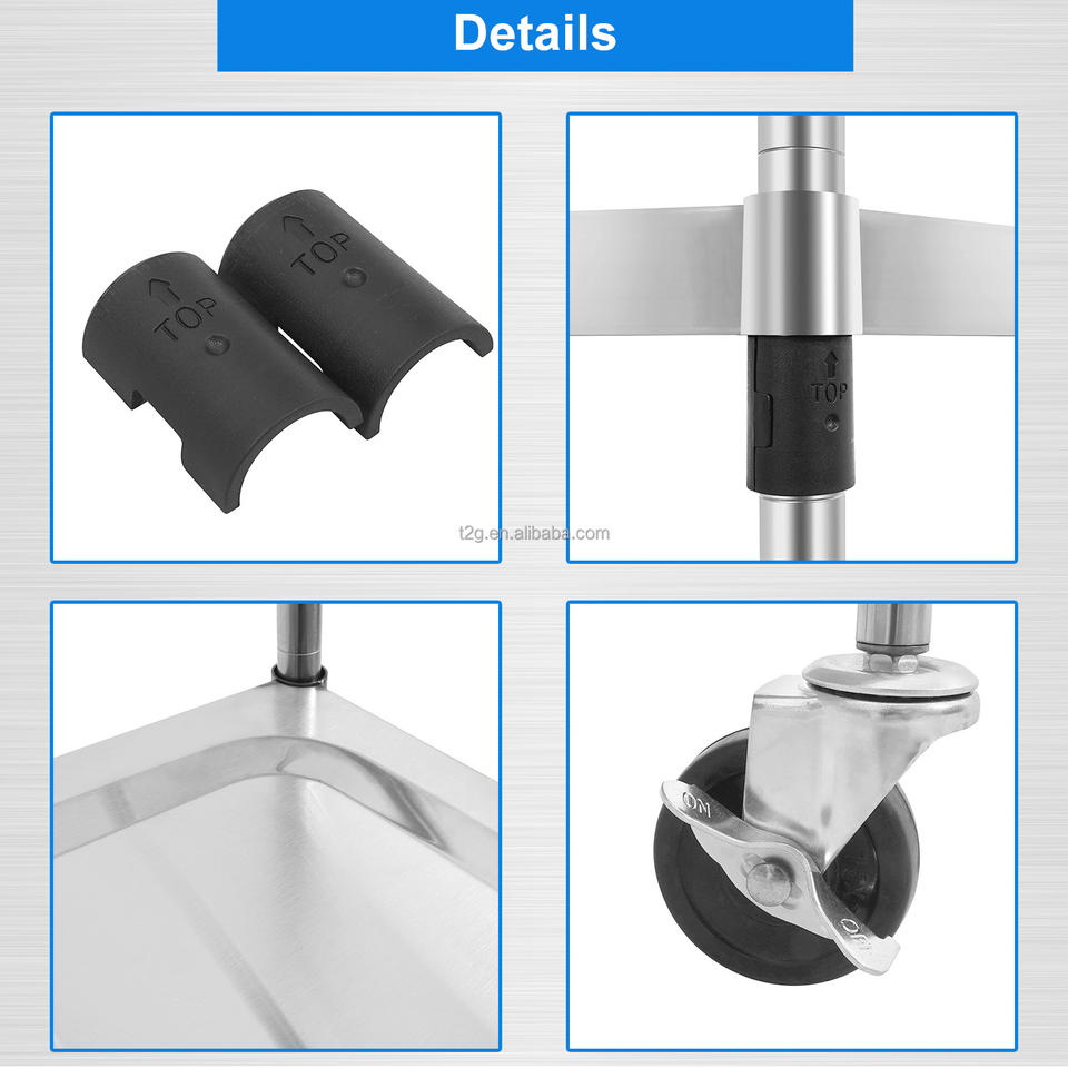 รถเข็นอาหารสแตนเลส T2G สำหรับงานหนัก สีเงิน ปรับความสูงได้ สำหรับครัวเชิงพาณิชย์