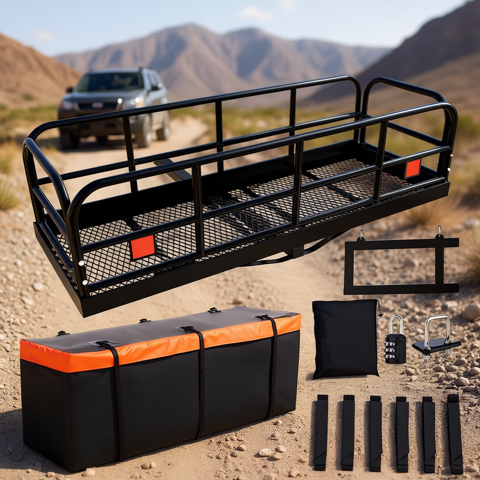 แร็คเหล็กสำหรับบรรทุกสัมภาระแบบพับได้ ขนาด 60 x 24 x 14 นิ้ว พร้อมถุงกันน้ำ สำหรับติดตั้งกับหัวลากขนาด 2 นิ้ว