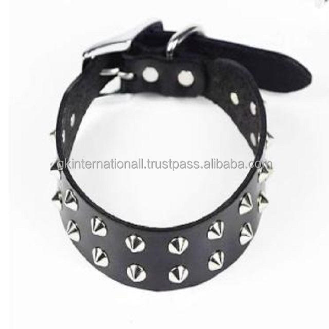 ปลอกคอสุนัขหนังสองชั้นประดับหมุดสำหรับสุนัขขนาดใหญ่ขนาดกลางพร้อมอุปกรณ์ทองเหลืองชุบนิกเกิล