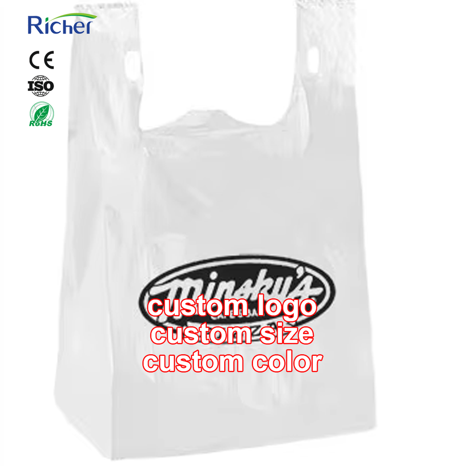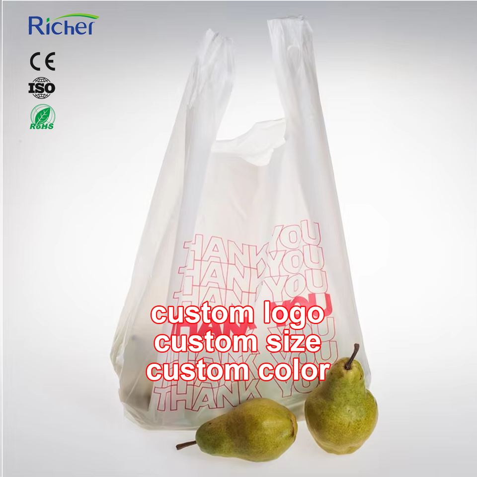 ถุงเสื้อยืดแบบหนาพิเศษพร้อมหูหิ้วเสริมความแข็งแรงสำหรับการช้อปปิ้งในร้านค้าปลีกและร้านขายของชำ