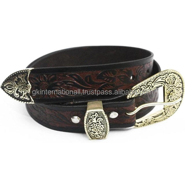เข็มขัดหนังลายนูนแบบหนาสีน้ำตาลแดงใช้เครื่องมือออกแบบลายดอกไม้โบราณหัวเข็มขัดแบบตะวันตกและปลายโลหะออกแบบได้ตามต้องการ