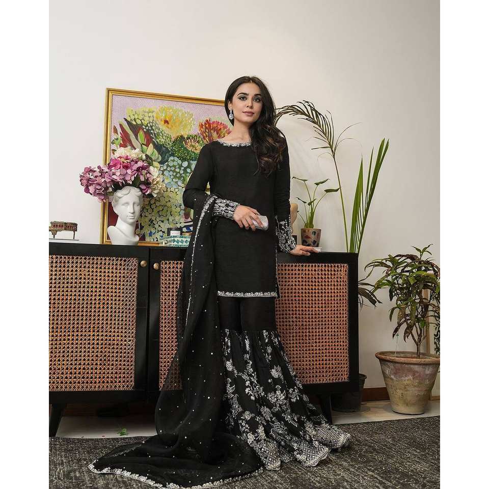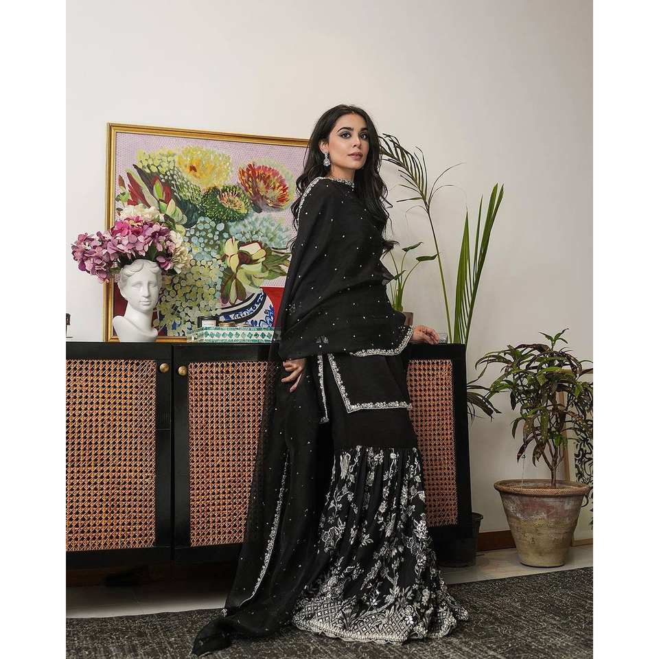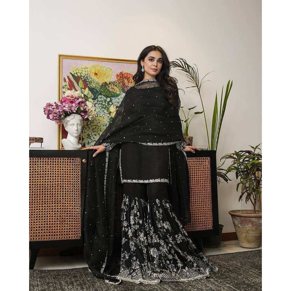 ชุดงานปักหนักสำหรับงานปาร์ตี้ ซัลวาร์ คามีซ เสื้อ-กางเกงพลลาโซและผ้าคลุมไหล่ ไซส์ XL ทำจากโพลีเอสเตอร์