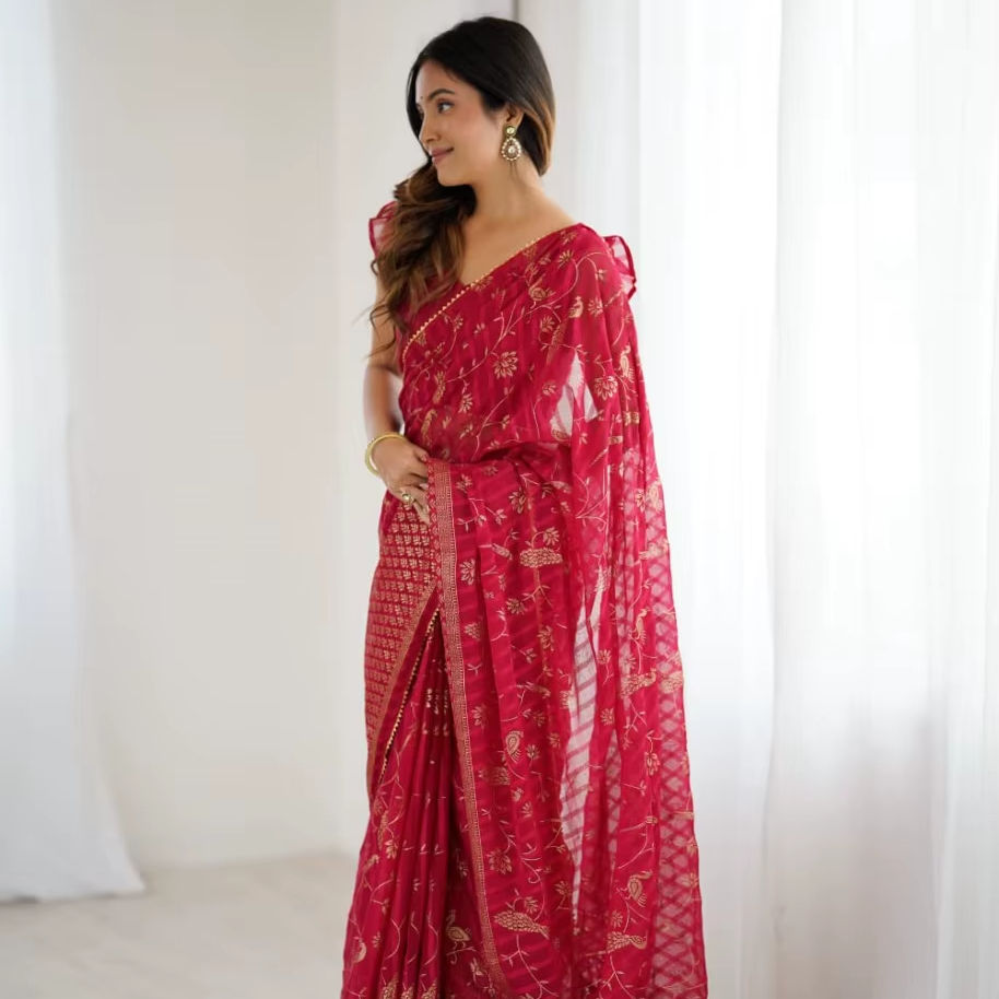 ชุดส่าหรีสีชมพูสำหรับผู้หญิงเสื้อเบลาส์แฟนซีของดีไซน์เนอร์บอลลีวู้ดจากอินเดีย