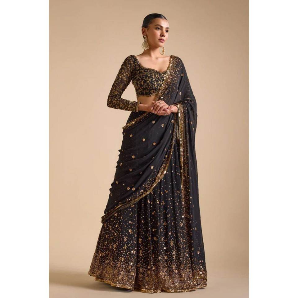 ชุดเลเฮนกาโชลีงานแต่งงานผ้าจอร์เจตต์เนื้อหนา พร้อมงานปักเลื่อม ชุดเสื้ออินเดียแบบมีซับใน สามารถปรับแต่งได้ นำเข้าจากอินเดีย