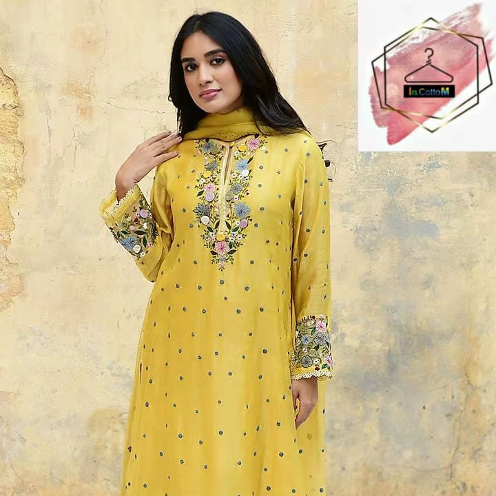 ชุดคุร์ตะยาวแบบหนาพร้อมกางเกงและผ้าคลุมไหล่ ผ้าจอร์เจตต์เทียมปักลายเลื่อมและขอบลูกไม้ ชุดเสื้อและกางเกงพร้อมผ้าคลุมไหล่ ราคาขายส่ง