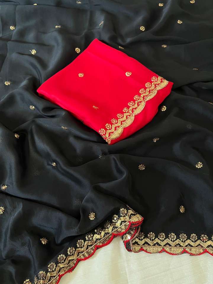 ผ้าซารีลายรังโกลีแบบหนา พร้อมงานปักเลื่อมหลากหลายสี ขอบผ้าลายฉลุ และเสื้อไหมปักเต็มตัว ไม่ยับ แห้งเร็ว เหมาะสำหรับงานปาร์ตี้