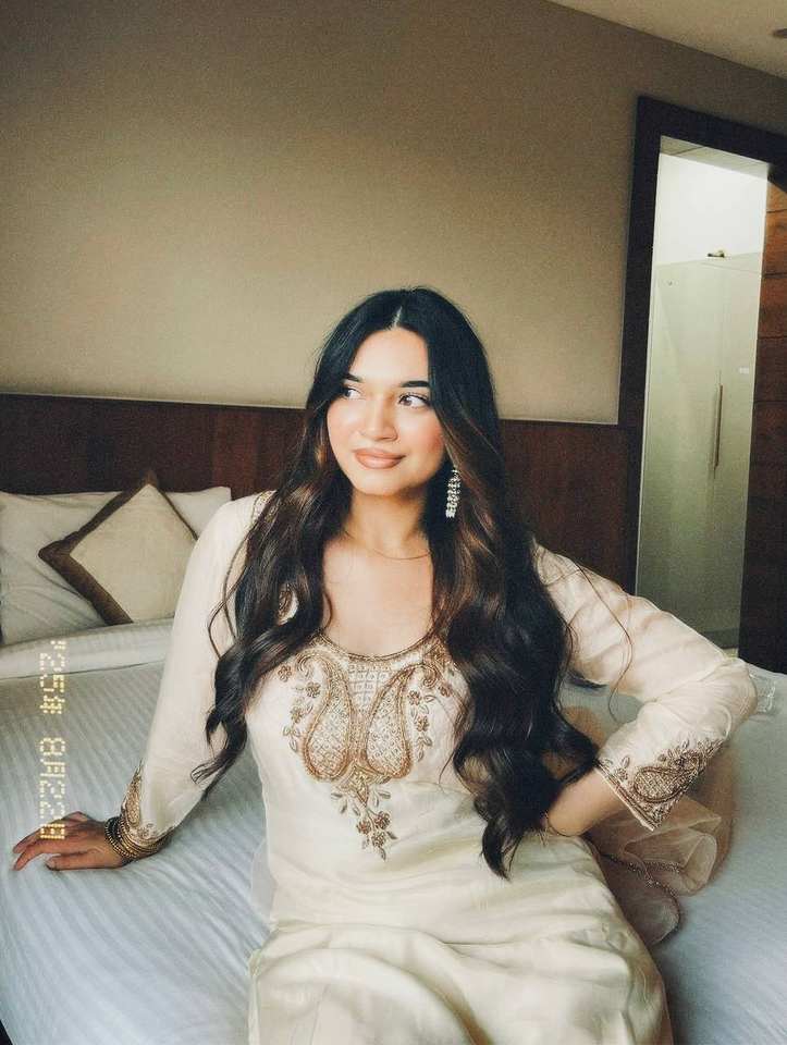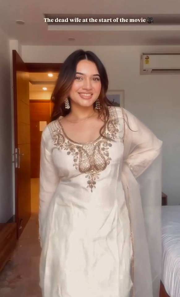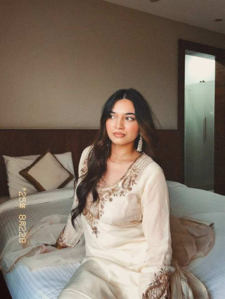ชุดคุร์ตีผ้าไหมโรมันเนื้อหนา พร้อมงานปักลายดิ้นและเลื่อม ประดับด้วยกางเกงเข้าชุด และผ้าคลุมไหล่ผ้าออร์แกนซาลูกไม้แฟนซี ชุดสำหรับผู้หญิงสไตล์ชาติพันธุ์