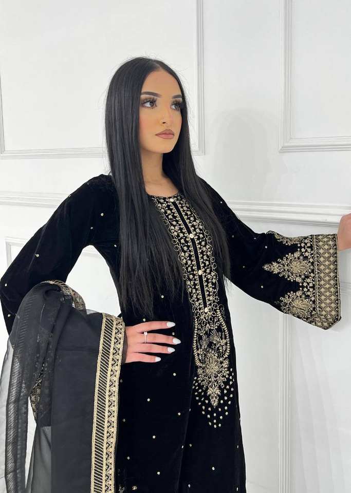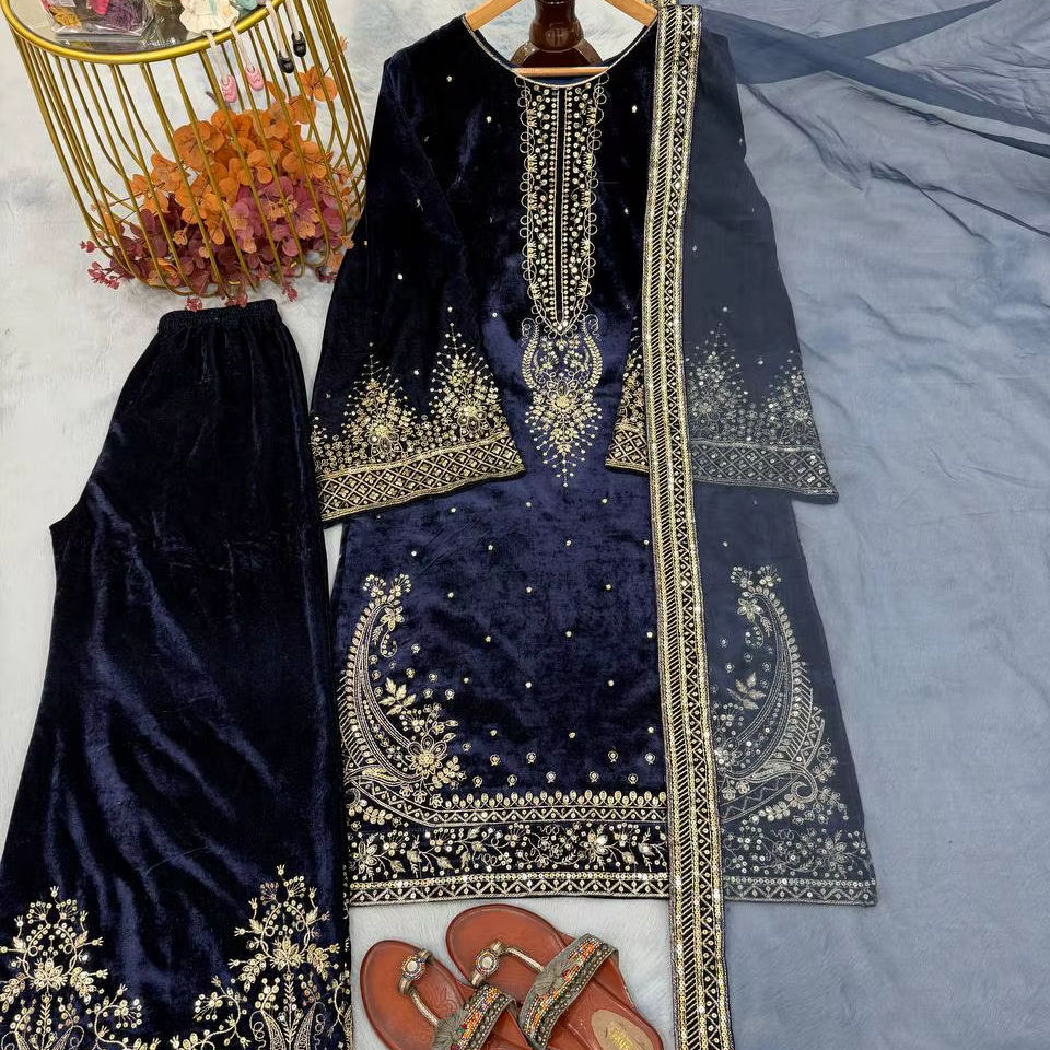 ชุดเดรสออกงานผ้ากำมะหยี่วิสโคสเนื้อหนา ปักลายประดับเลื่อม พร้อมกางเกงขายาวทรงปาลาซโซ และผ้าคลุมไหล่ผ้าออร์แกนซ่า สำหรับผู้หญิง ชุดออกแบบสำเร็จรูป