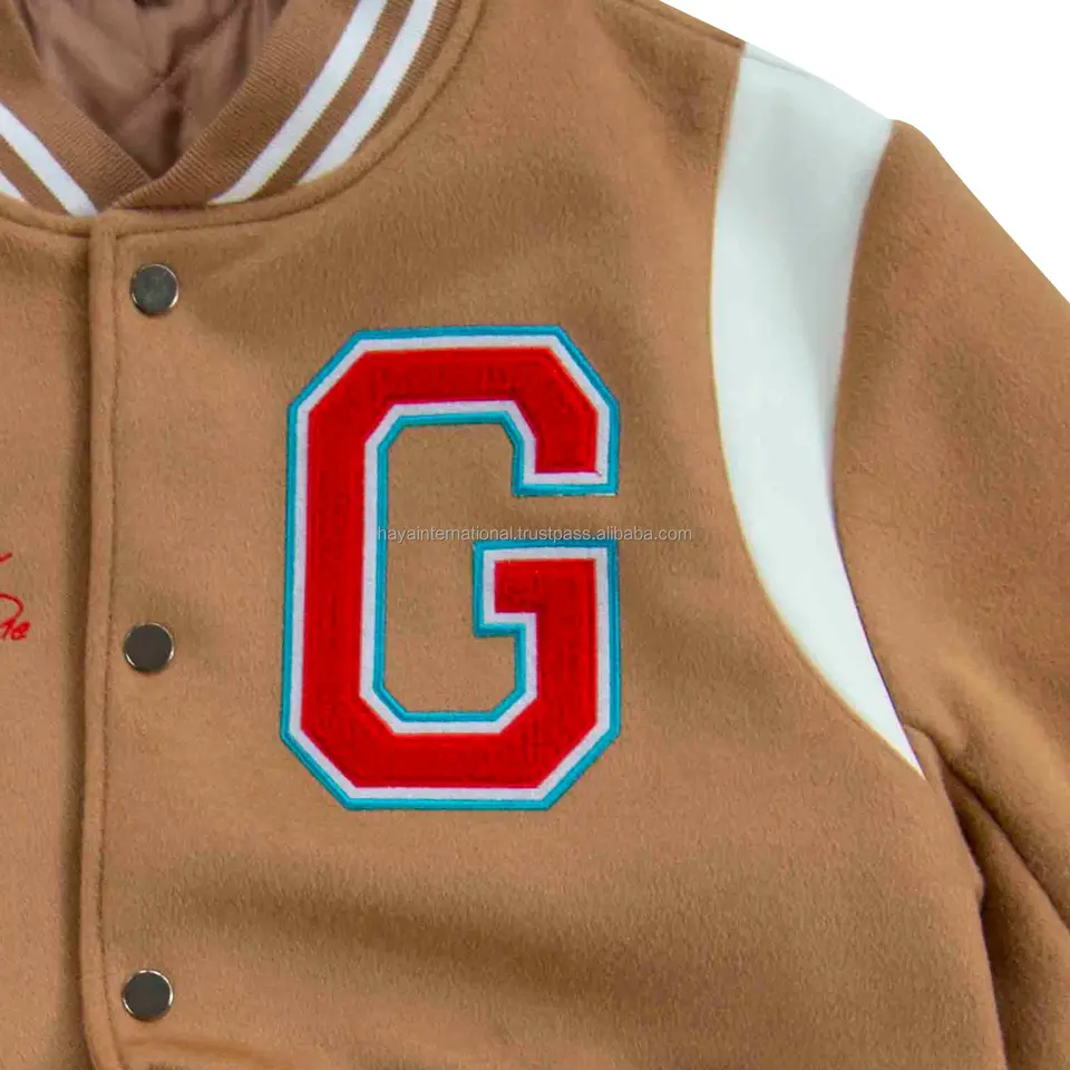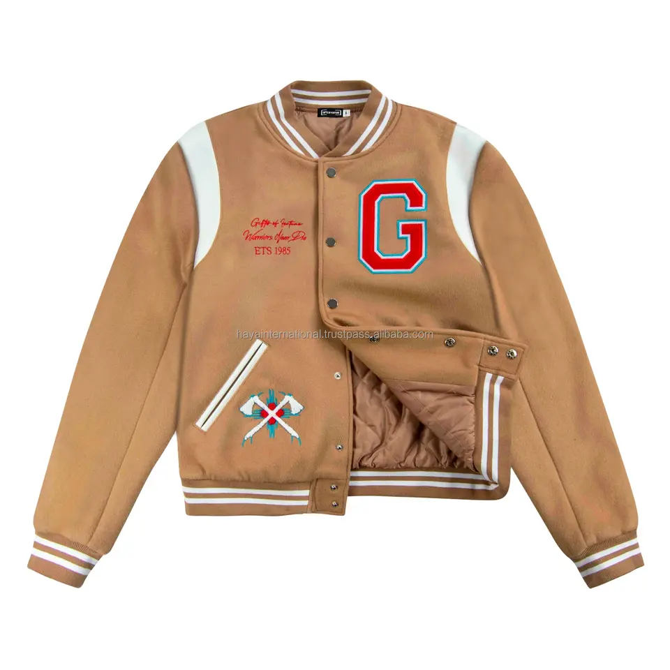 แจ็คเก็ตวาร์ซิตี้ทรงเลตเตอร์แมน ผ้าวูล 100% คอตั้ง ปักโลโก้ด้านหน้า แต่งหนังแท้ ปักลายเชนิลล์