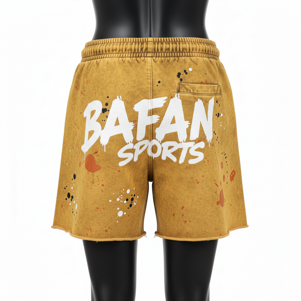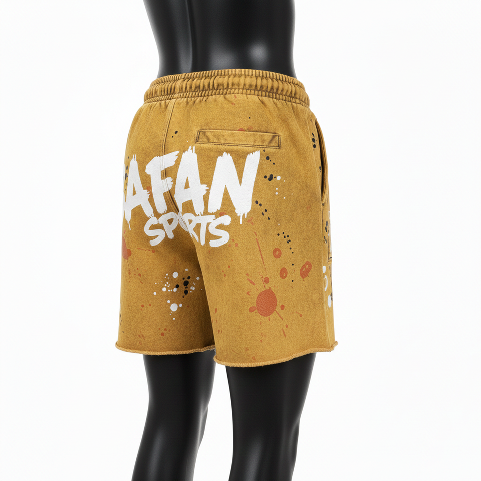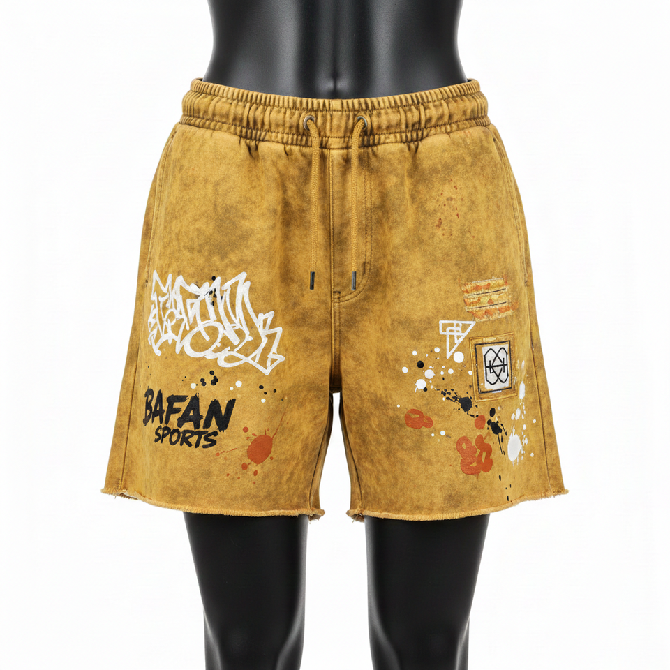 กางเกงขาสั้นผ้าฝ้ายฟลีซหนา 300 GSM ล้างสีแบบแอซิดวอช สีมัสตาร์ด ลายพิมพ์สกรีนโลโก้แบบกำหนดเอง ทรงลำลองสำหรับผู้หญิง