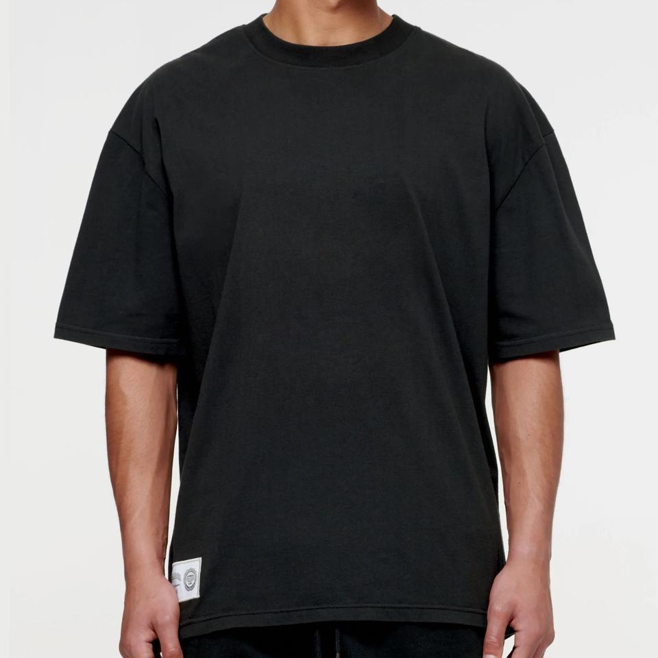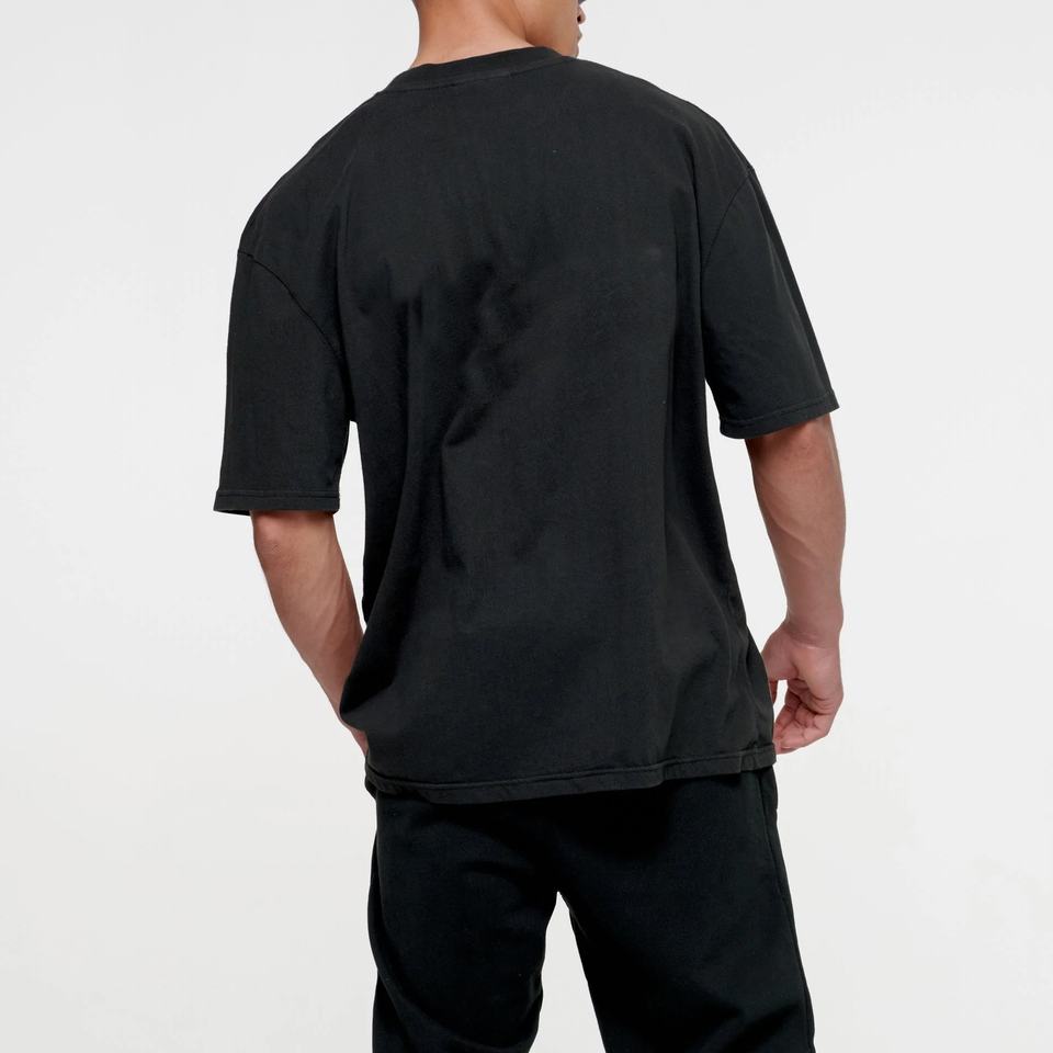 เสื้อยืดโอเวอร์ไซส์ผู้ชาย ผ้าถักเนื้อหนัก 350gsm สีดำ ทรงหลวมไหล่ตก สไตล์สตรีทแวร์ ผ้าฝ้าย 100% ทรงบ็อกซี่ พิมพ์ลาย สปอร์ต ฮิปฮอป