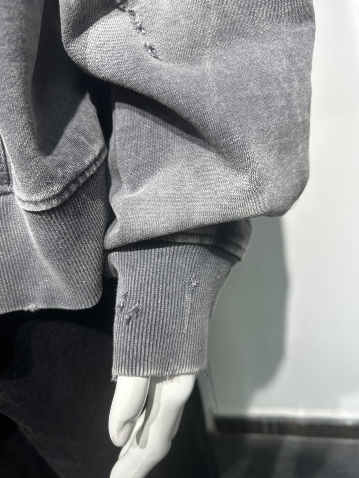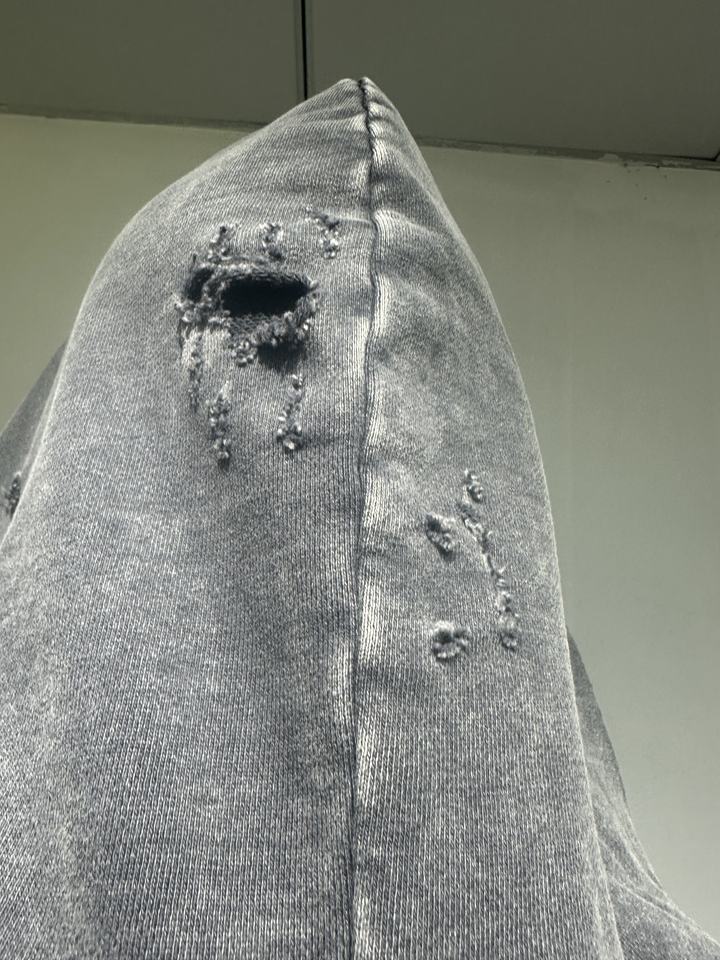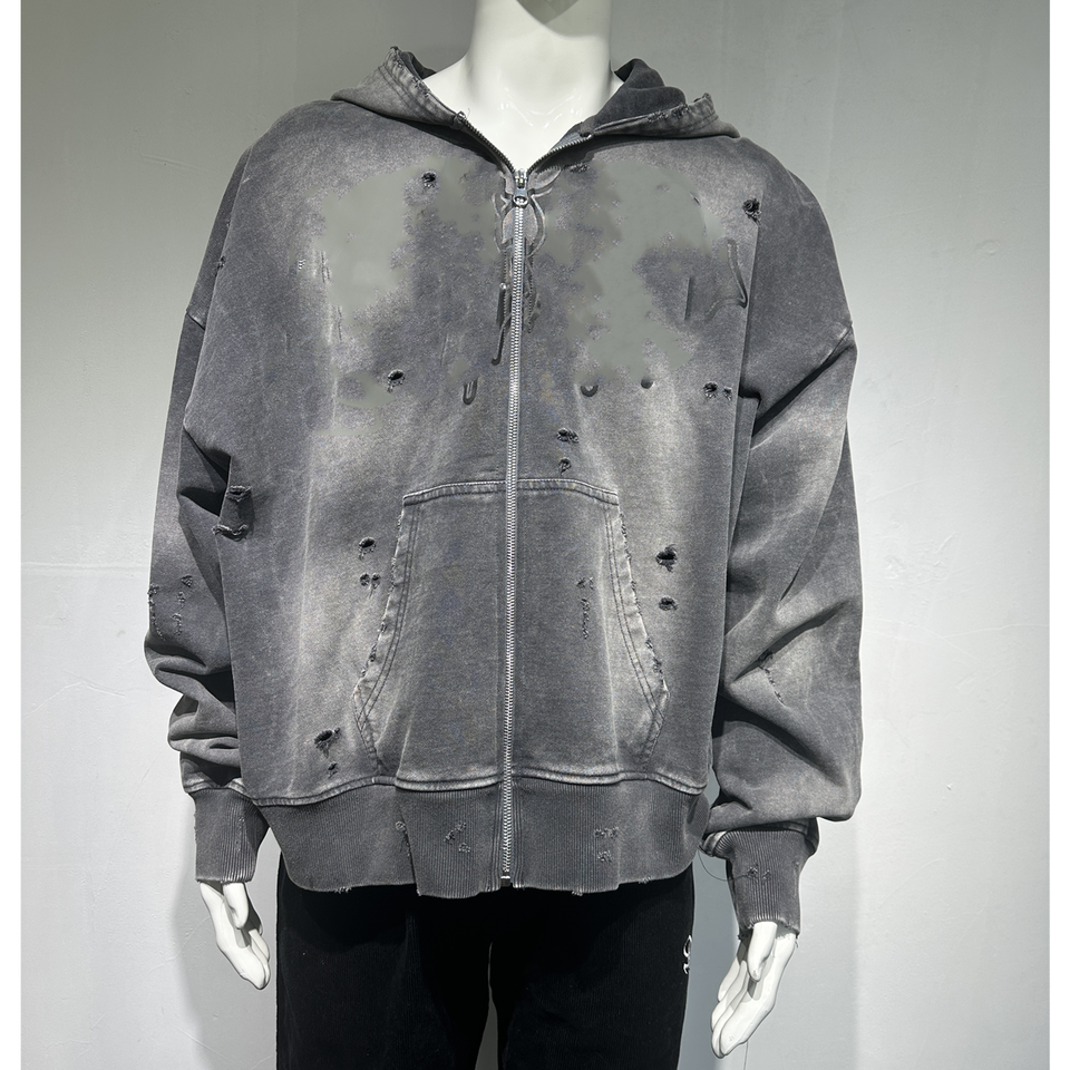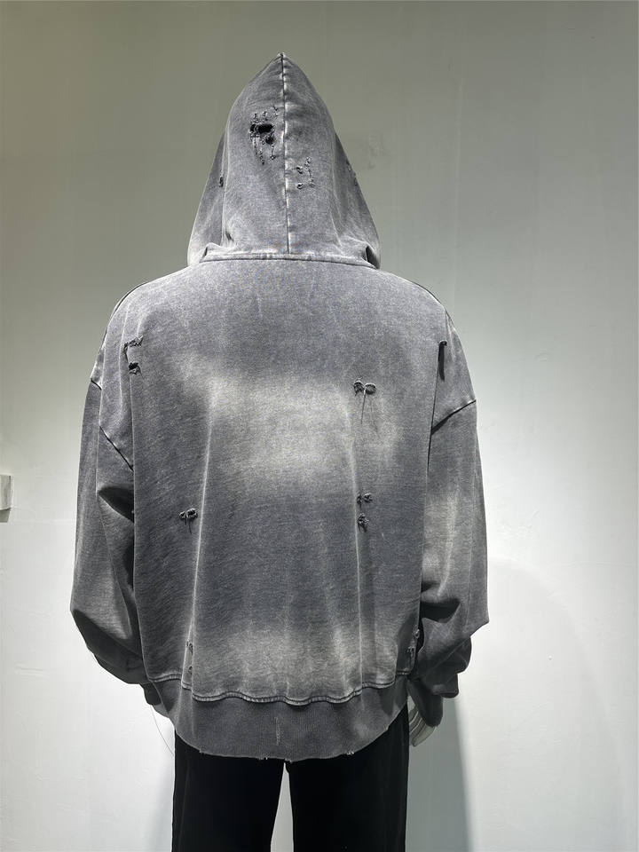 เสื้อฮู้ดดี้ผู้ชายทรงโอเวอร์ไซส์แบบซิป สไตล์สตรีทแวร์วินเทจ ล้างสีแบบแอซิดวอช แต่งขาดๆ มีกระเป๋า ผ้าหนาพิเศษ