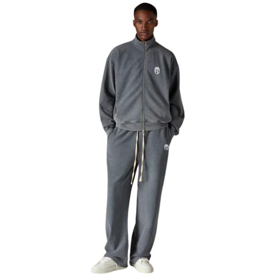 ชุดแจ็คเก็ตคอเต่าซิปผ่าสีเทาแบบหนาเนื้อผ้าริบ และกางเกงจ็อกเกอร์สำหรับผู้ชาย ผ้าฝ้าย สตรีทแวร์ แฟชั่น