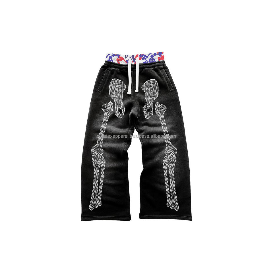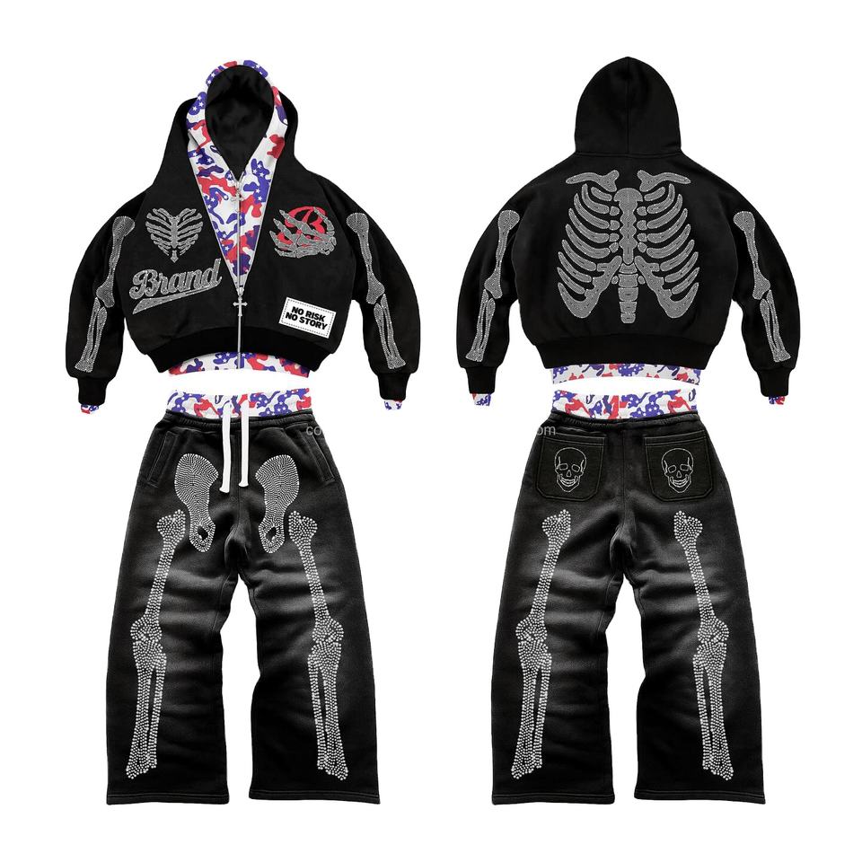 ชุดเซ็ตเสื้อฮู้ดดี้ทรงโอเวอร์ไซส์แบบมีซิป ประดับเพชรระยิบระยับ ล้างสีแบบ Mud Spray พร้อมกางเกงวอร์มเอวสองชั้น