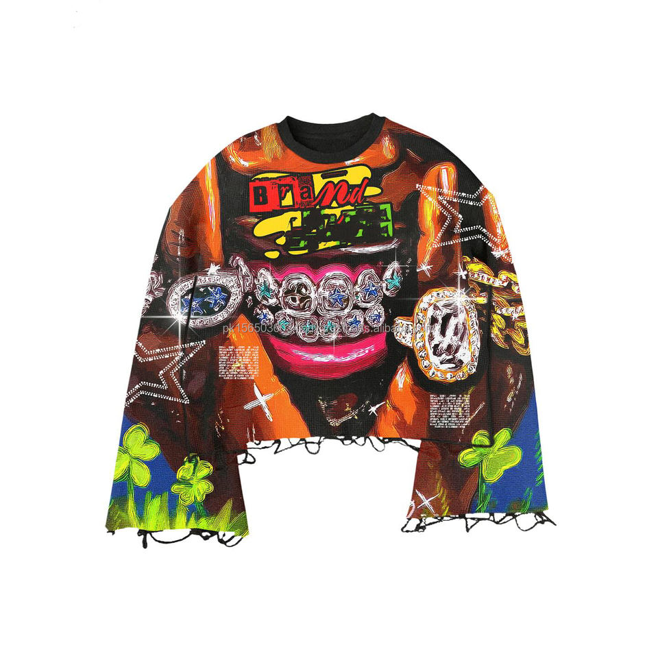 เสื้อยืดฮิปฮอปผู้ชายทรงโอเวอร์ไซส์ แขนยาวสองชั้น ล้างสีแบบแอซิดวอช ประดับด้วยคริสตัลขนาดใหญ่ ผ้าฝ้าย 100%