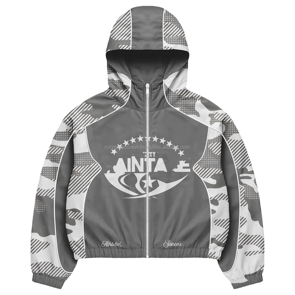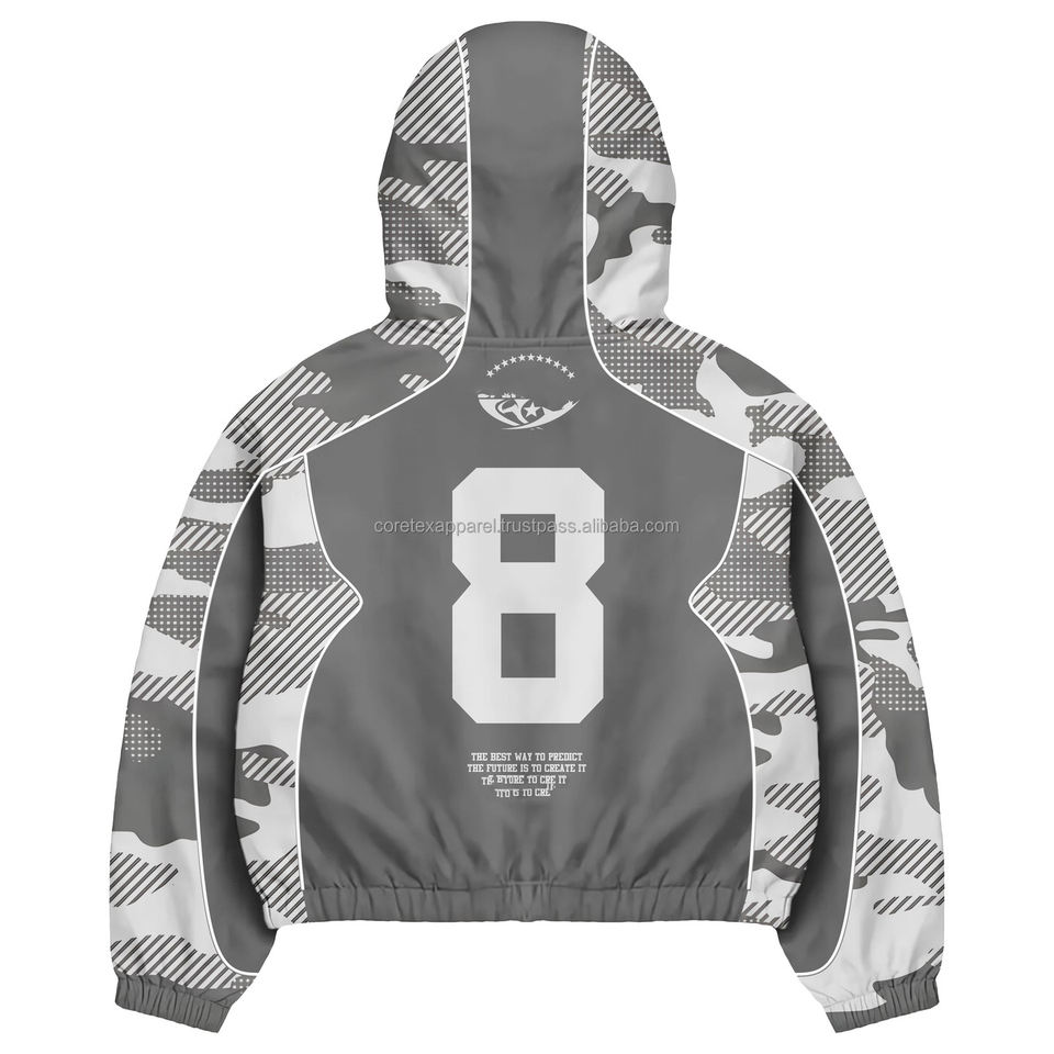 ชุดเสื้อกันลมหนัก 180 GSM ผ้าไนลอนโพลีเอสเตอร์ทอสีเทาขาวลายพราง พร้อมโลโก้แบบกำหนดเอง