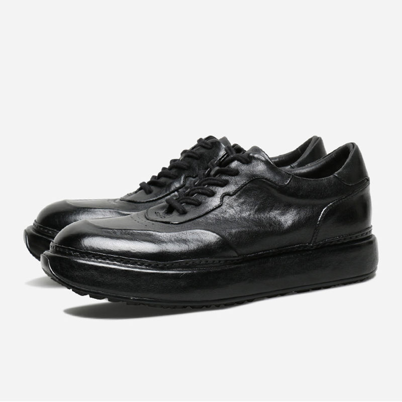 รองเท้าลำลองธุรกิจ QIFON งานแฮนด์เมดระดับไฮเอนด์ ระบายอากาศได้ดี น้ำหนักเบา หนังสีดำ พื้นหนา เพิ่มความสูง สไตล์เยอรมัน